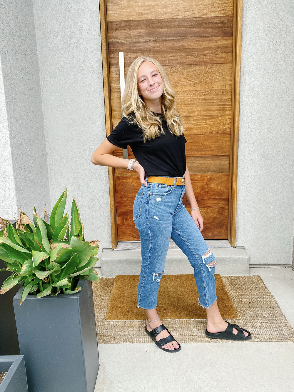 I keep it pretty simple for my favorite bottoms too, sticking to 3 categories. Leggings, distressed jeans, and denim skirts. First up is leggings. I love to pair them with a cute oversized graphic tee or hoodie for a cute so comfy casual look for school. Second is distressed jeans. Ripped jeans, especially in the mom jean style have always been my favorite. They are so cute and I love that they are not super tight or baggie. The last thing I chose for bottoms was a denim skirt. I love wearing these when I just want to feel a little more ready and more dressed up but not too much. You could dress it up with a more fitted basic top or go more casual with the graphic tee again.