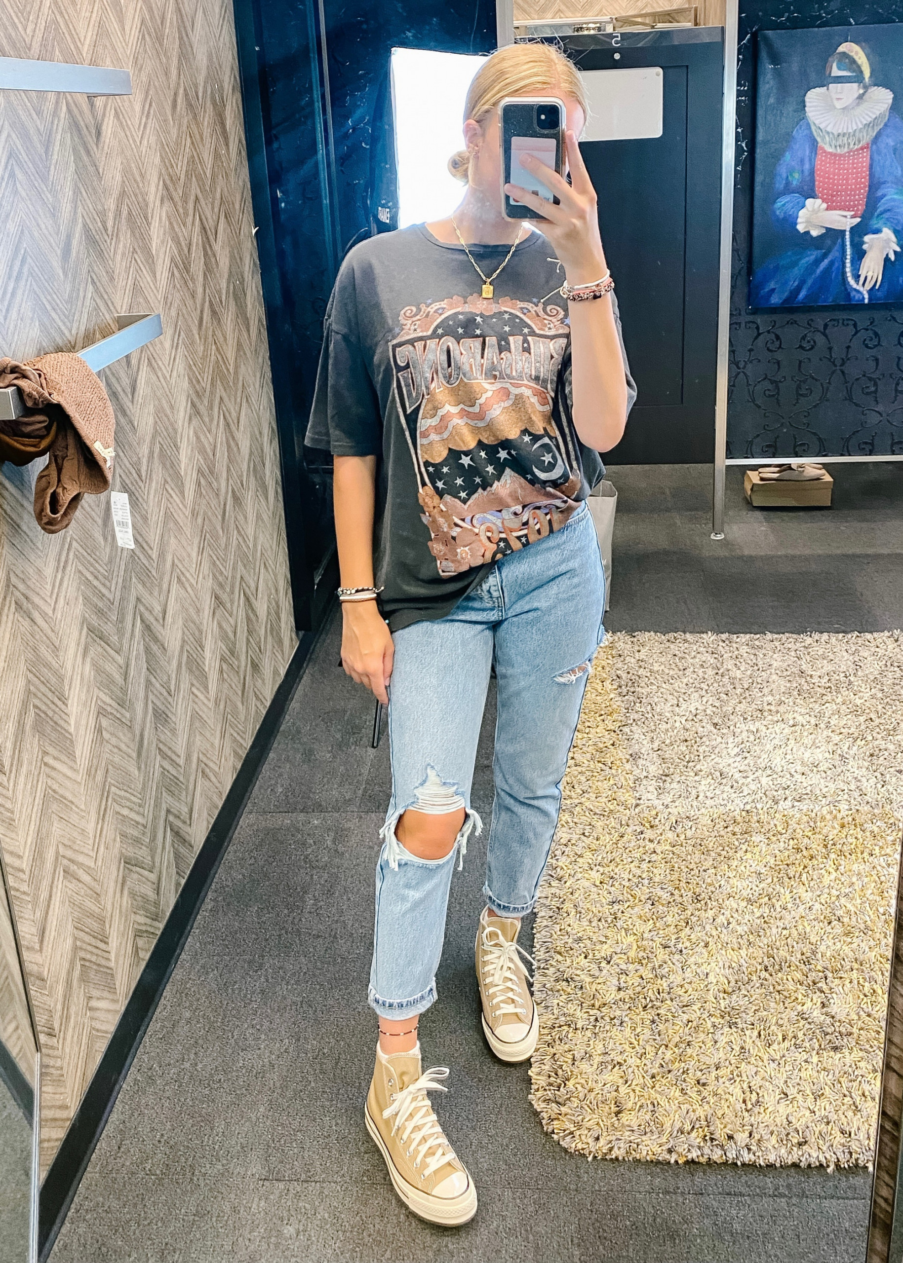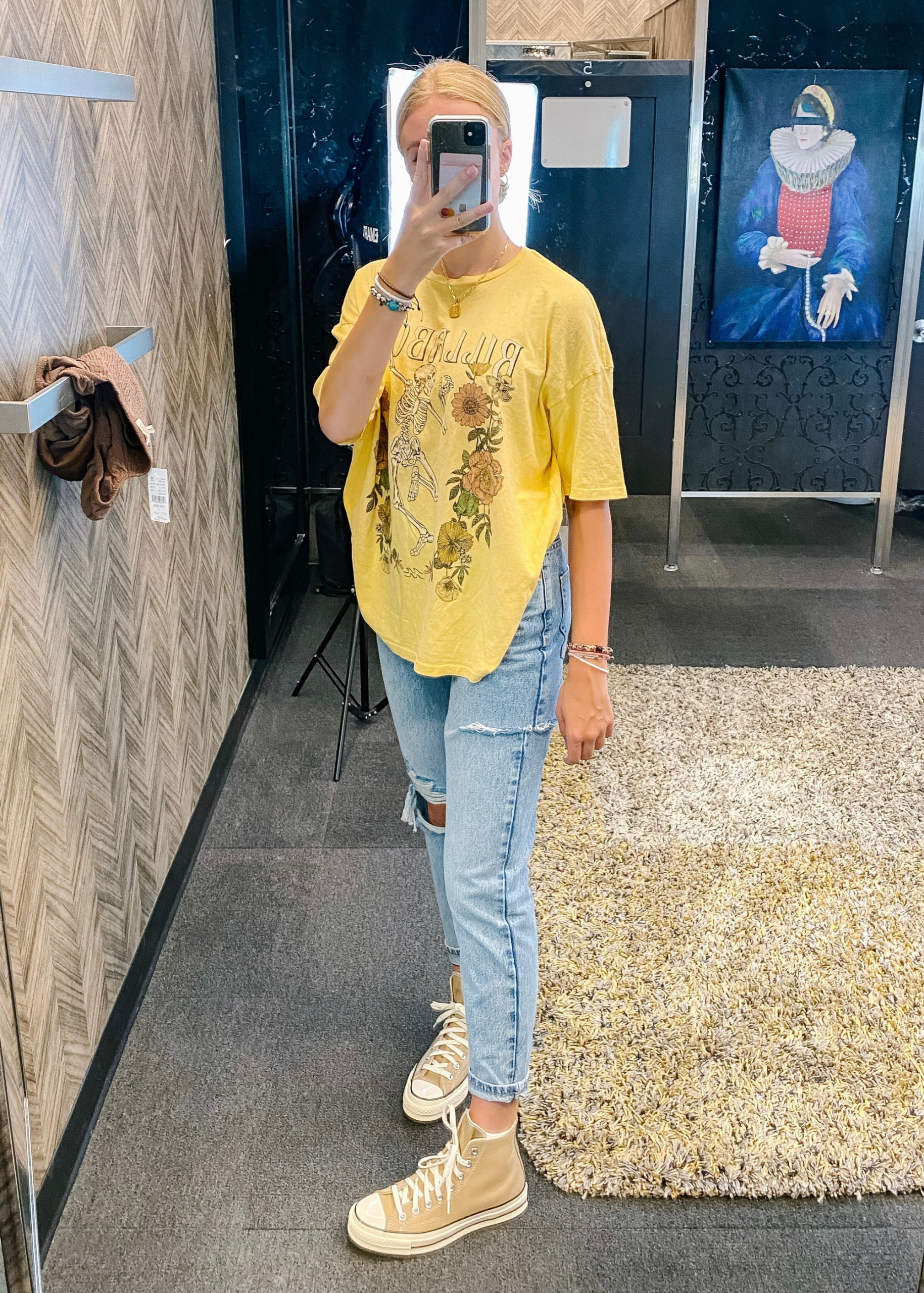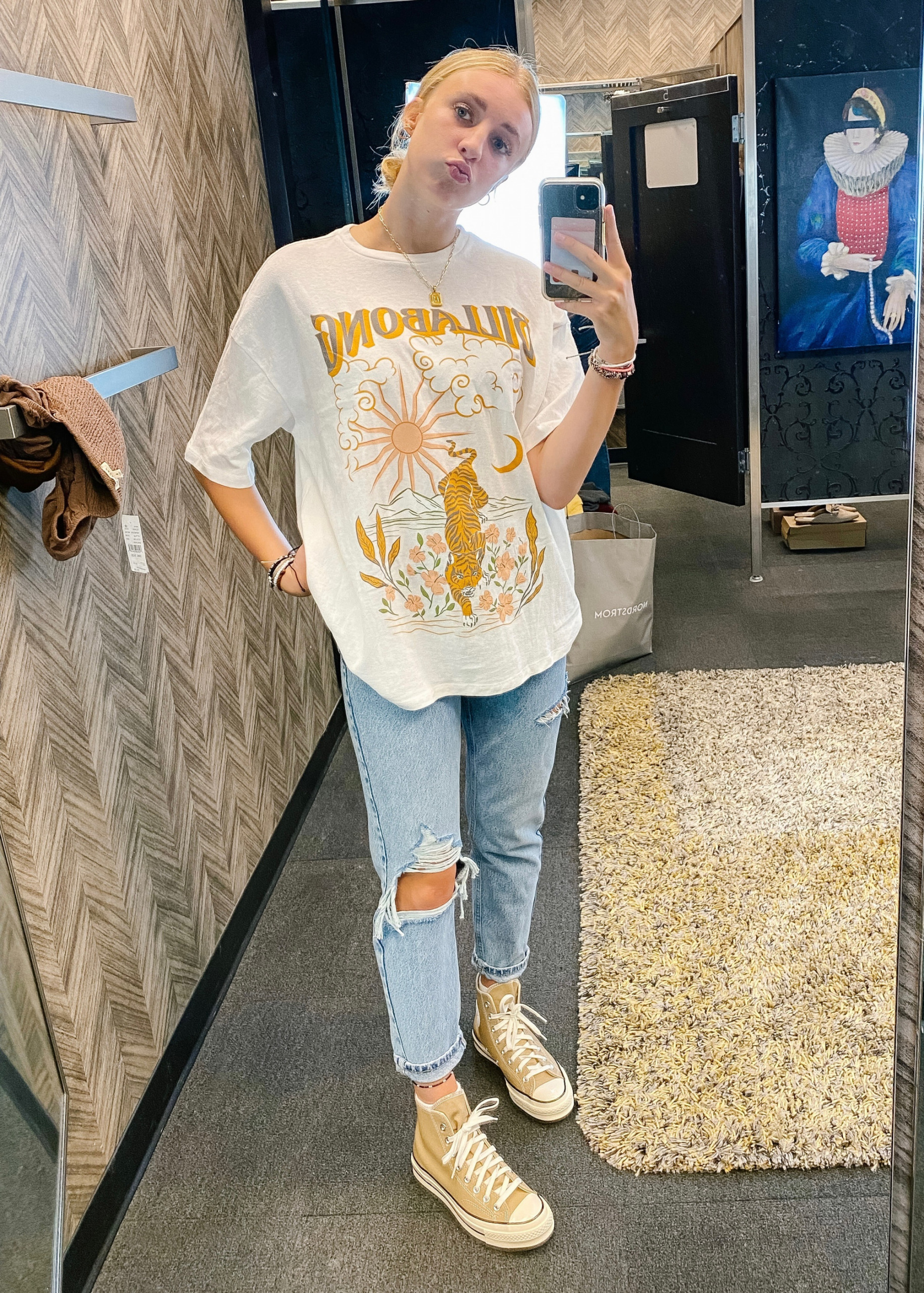TEE SIZING DETAILS: wearing a small – oversized fit