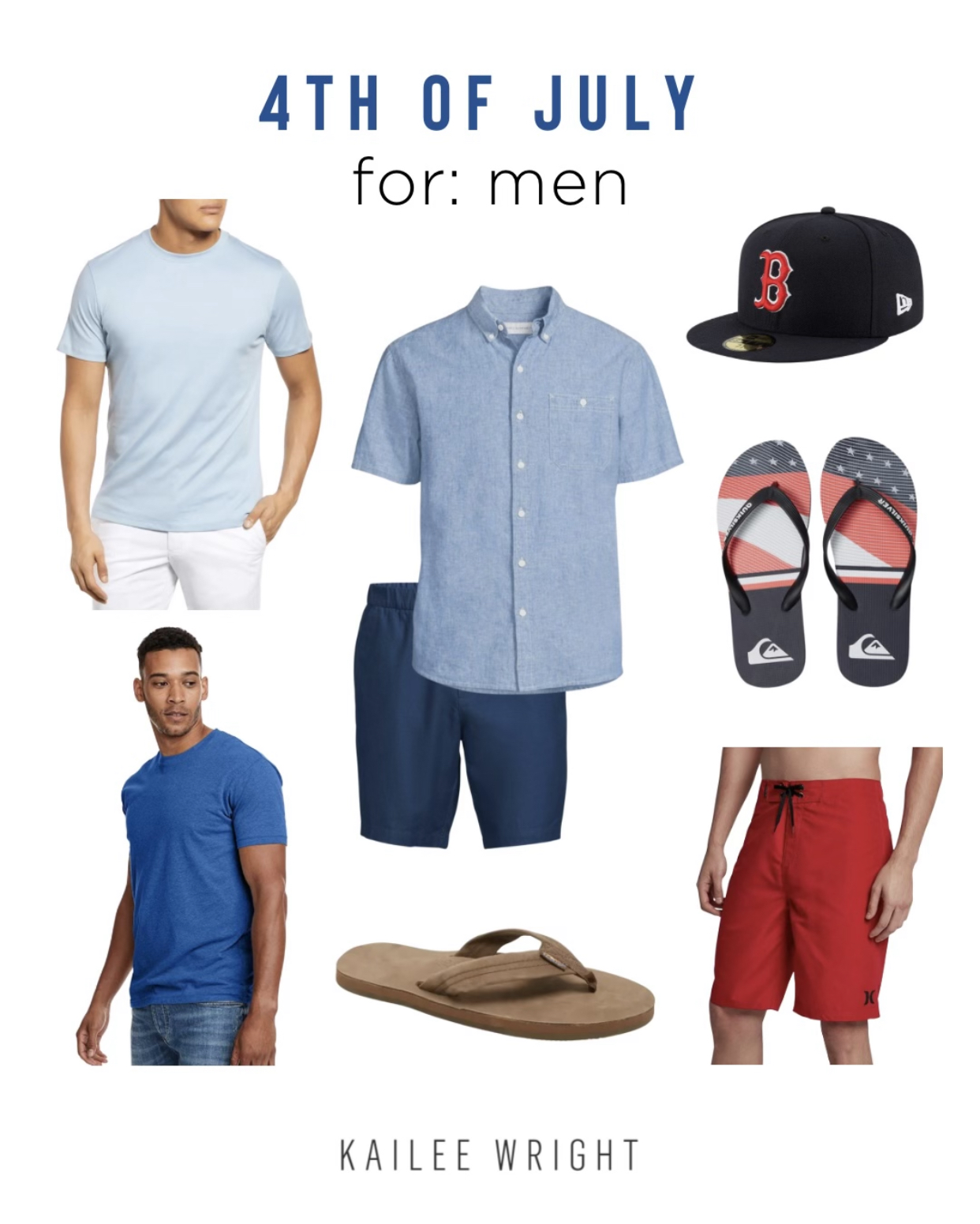 blue + white stripe tee | flip flops | red hat | blue hat | white tee | red tee | blue tee | shorts | swim
