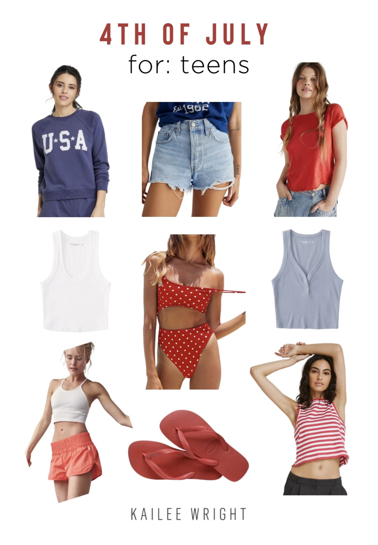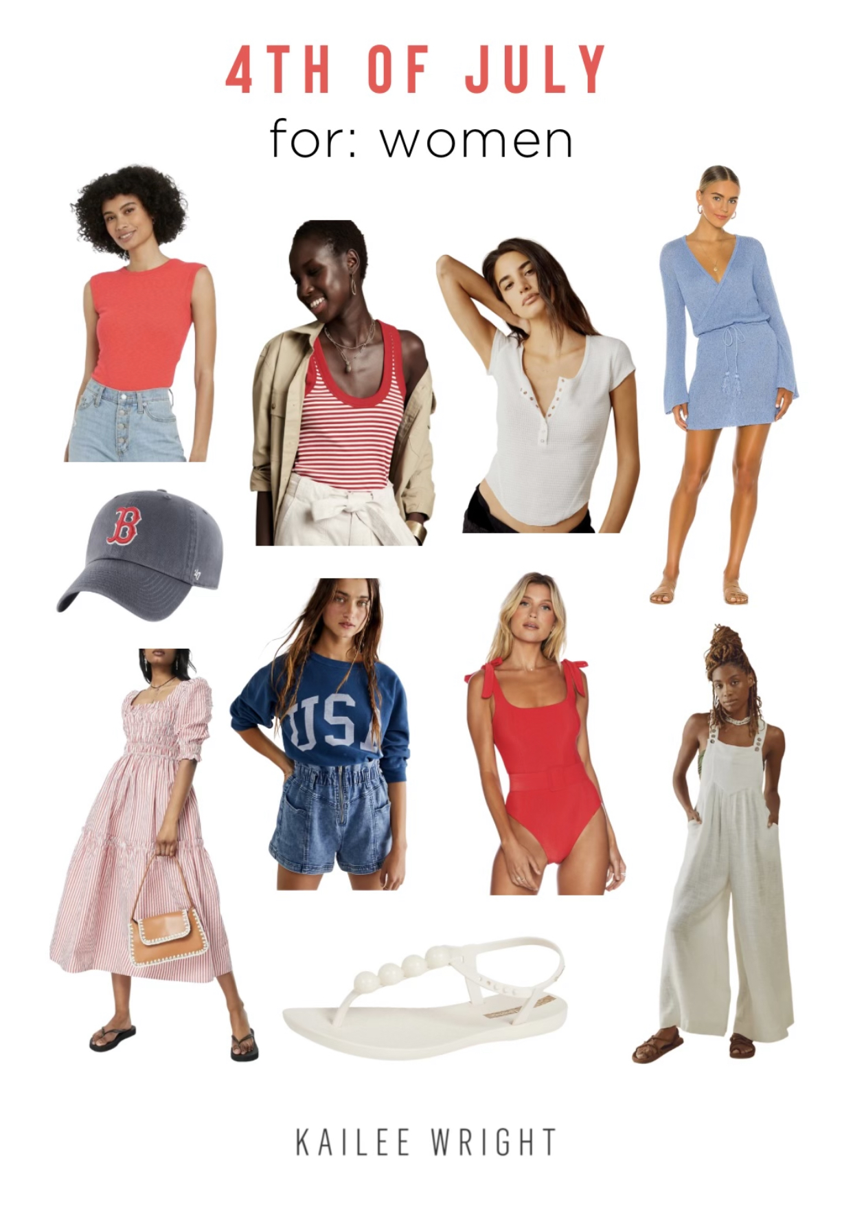 flag tee | henley tee | sandals | blue knit dress | red swim | red + white tank | overalls | red top | hat | usa sweatshirt | red + white dress