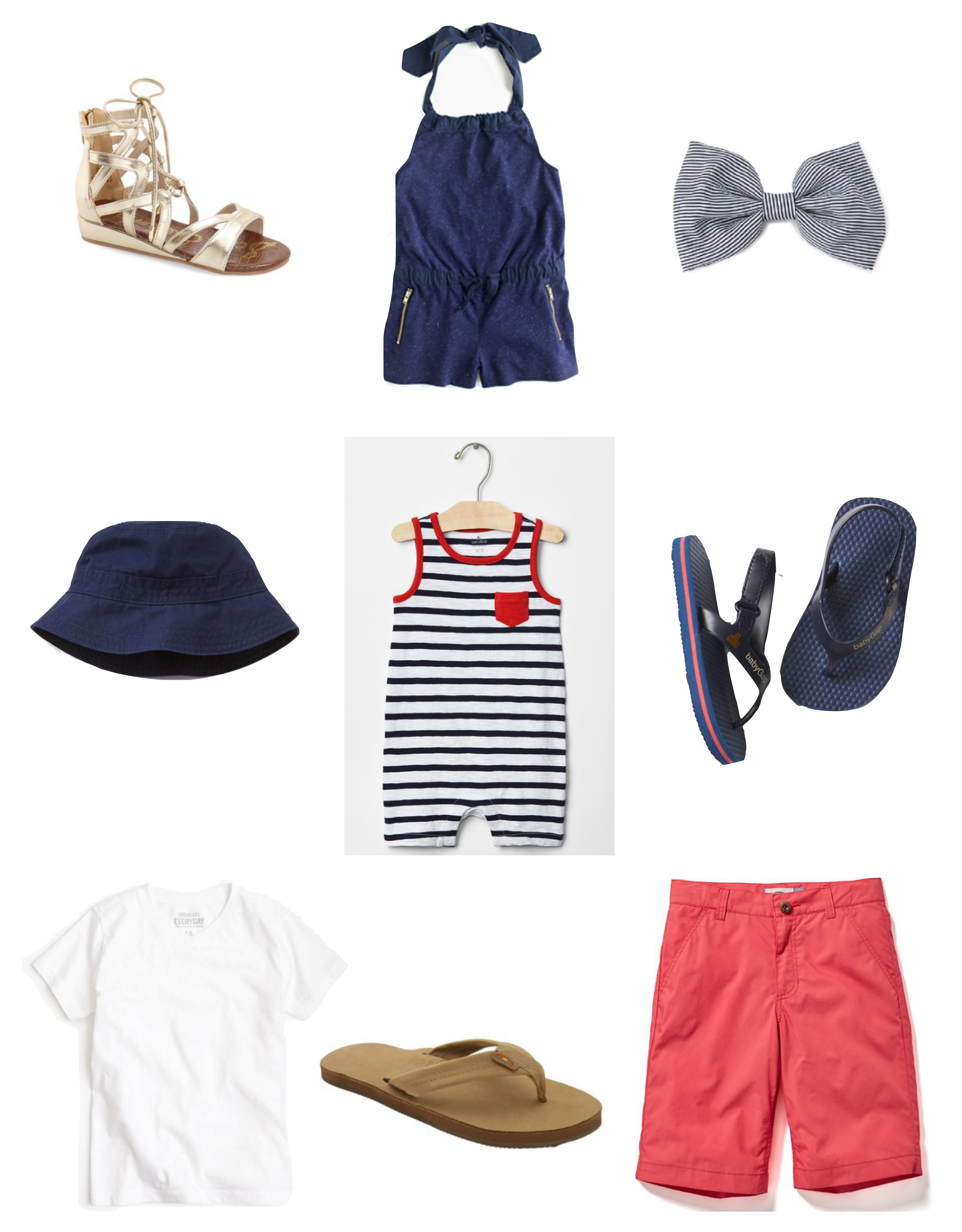 girl: sandals | romper | bow || baby: hat | onesie | flip flops || boy: shirt | flip flops | shorts