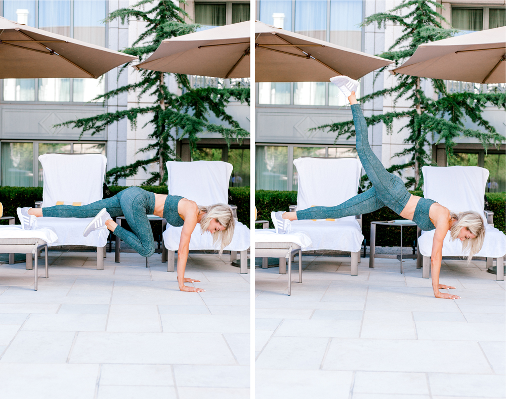 Last but not least is the ab + booty burn. I know this is not at all the official name, but it describes it best to me! Haha! You will start with your feet up just like the decline push up, hands in the same push up position. Then you take one leg and pull it in towards your chest and kick it back and up. Repeat with opposite leg.