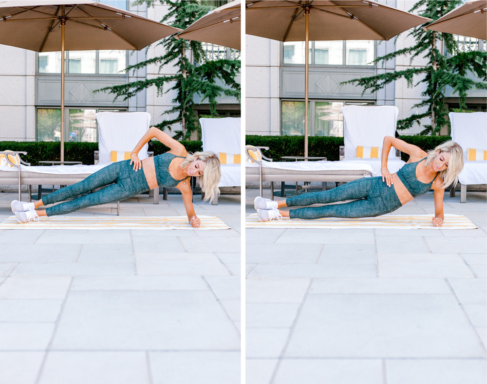 I don’t know about you, but these little oblique muffin top devils are the hardest to tighten up. When I plan out my workout, I always try to include something that will target that area. This is probably the simplest option to get a quick burn. You just lay on your side with one arm out and crunch up towards your hip bone, keeping your legs together and straight.