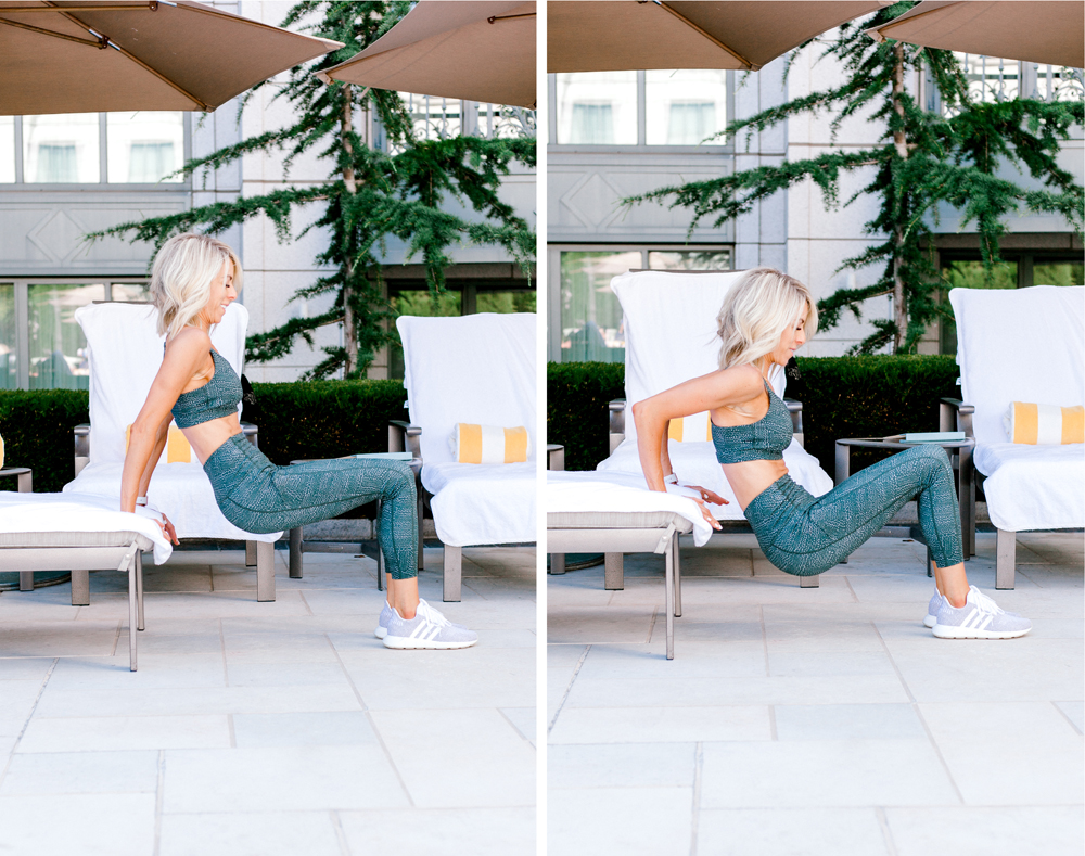 Just thinking about these make my arms burn! They are a quick way to get in a great arm workout while traveling. If you are confined to a hotel room, you can use the bed, the bath tub, or even the seat of a chair to hold on to while you dip down.
