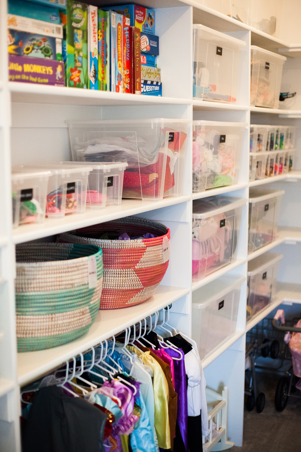 I think my number one favorite thing about the playroom closet is the “extra box”. It is the simplest concept, but has made the biggest difference with attitudes during clean up. All I did was add an extra clear box, that isn’t the designated home for anything. My people know that if we are in a rush to clean up, and there are a few odds and ends, they can throw everything in that extra box. Usually once a week or so, they know they have to go through the extra box and put things where they really go. It keeps the room looking clean + organized all the time, and has saved us from a lot of whining!