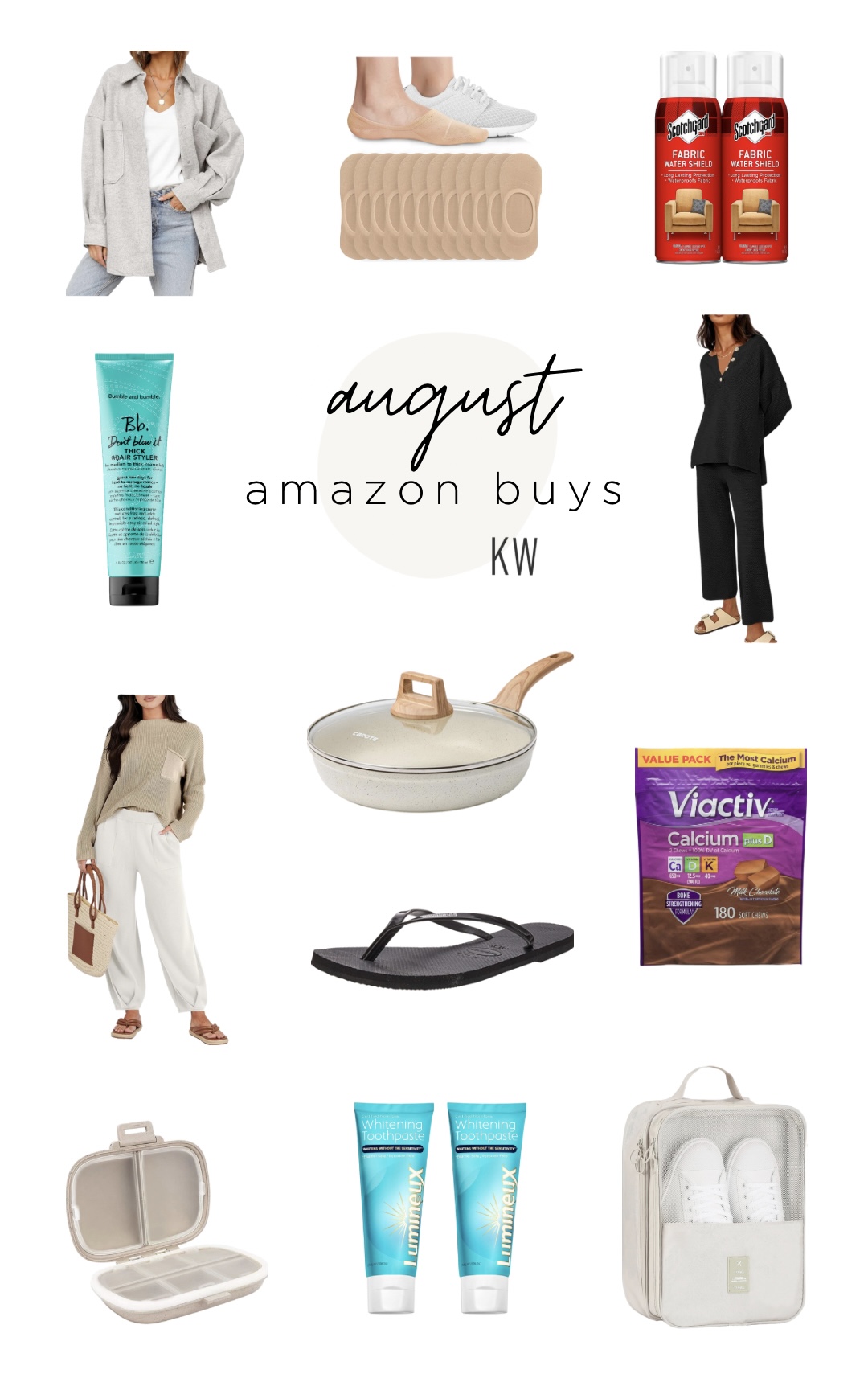 shacket + no show socks + scotch guard + hair cream + black set + khaki set + nonstick pan + flip flops + calcium supplements + pill organizer + whitening toothpaste + travel shoe holder