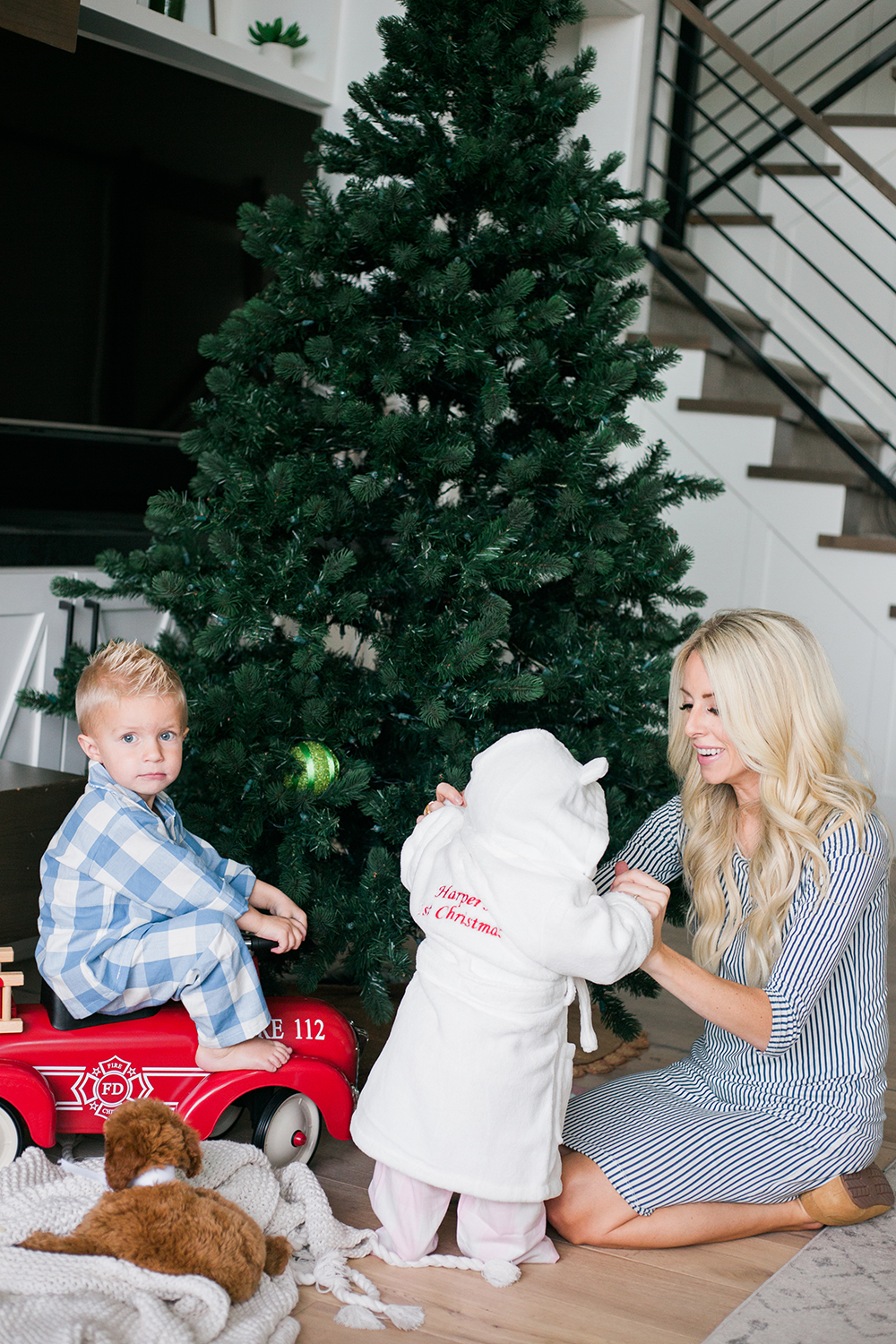 I’ve mentioned on here before that every year my little people get to open new pajamas on Thanksgiving. Since those are Christmas themed, I love to get them some on Christmas Eve too. As you can see by the pictures, I gave in and gave the babies theirs a little early! They were too cute and cozy to resist, and I about died when I saw Harper in this sweet robe.