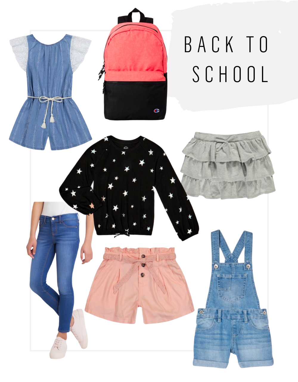 favorite girls basics : romper | backpack | sweatshirt | jeans | overalls | skirt | shorts
