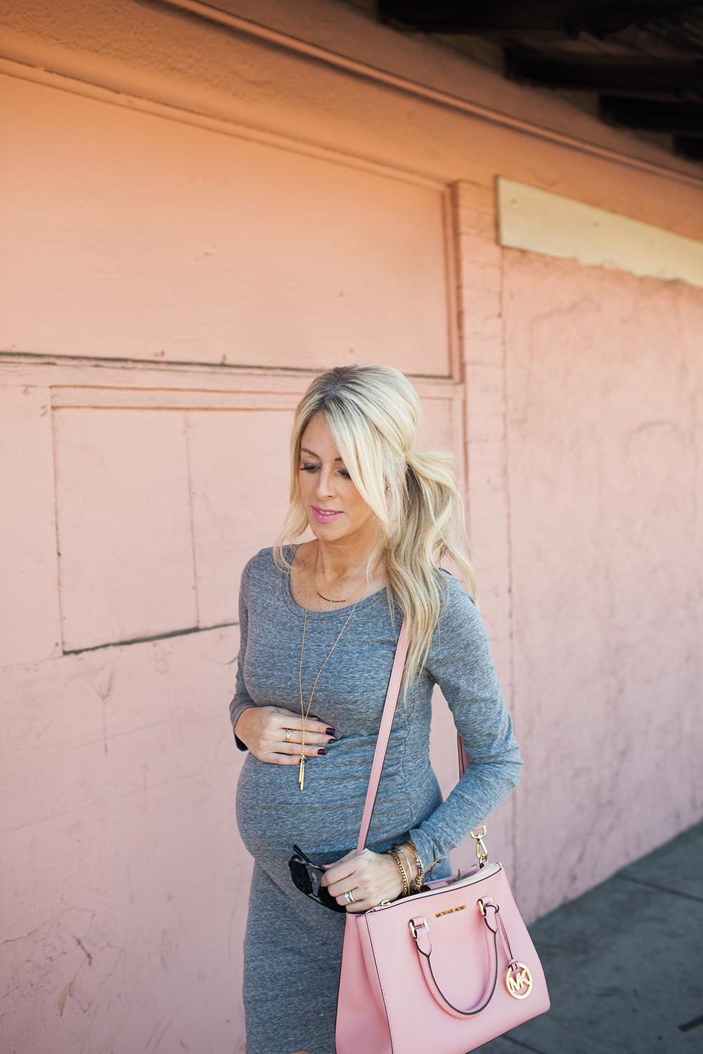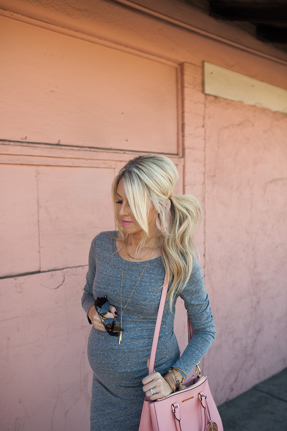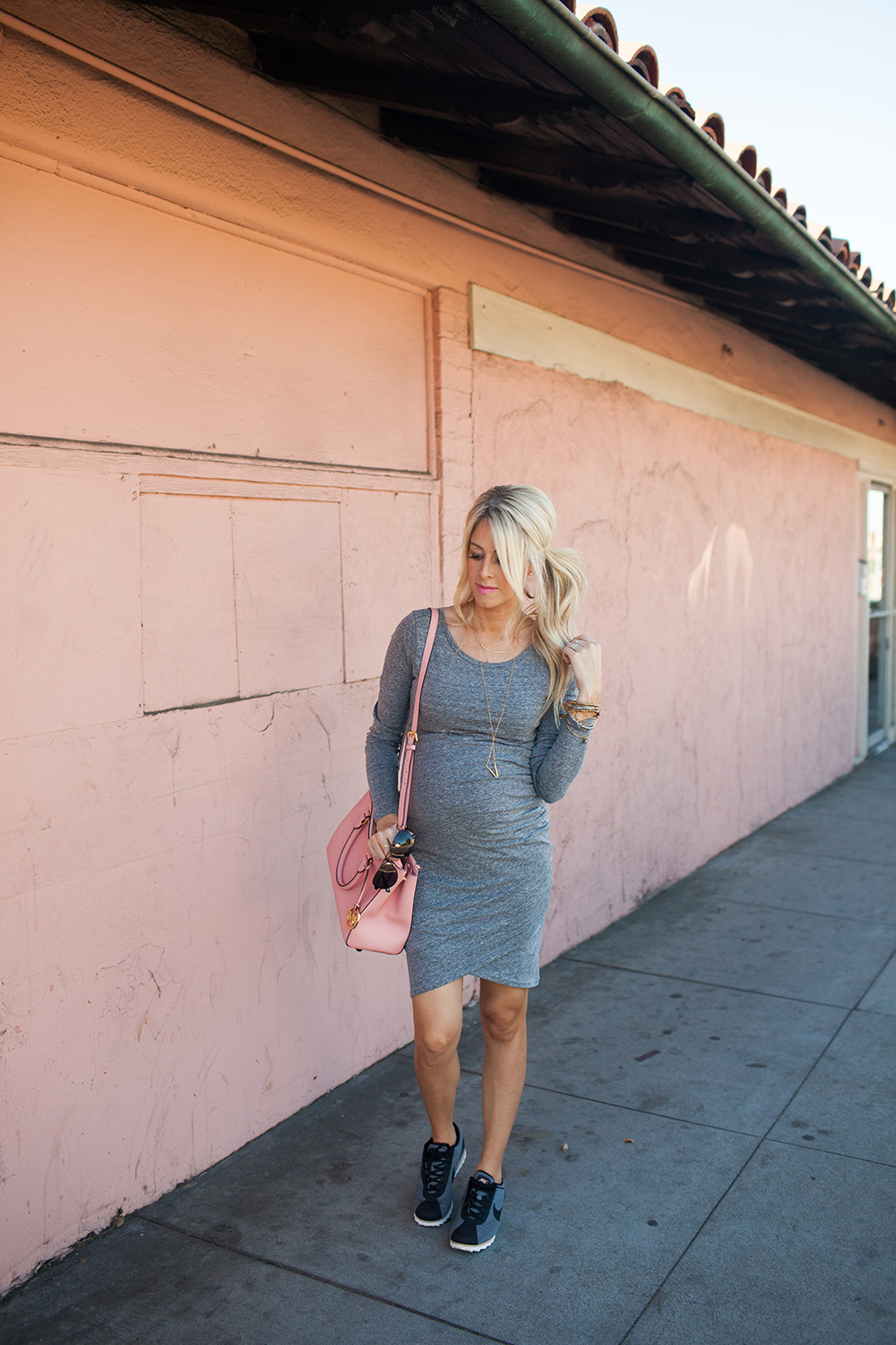 I love this grey non-maternity dress (that is under $60)! It’s bunched on the sides which gives it some stretch for the belly (I sized up one size, yet it still fits great for those who are not pregnant. I love finding great non-maternity dresses that I can wear while pregnant and that can still work for after baby — because who doesn’t love to save a bit of money? And when you find a good basic staple you want it to last!! I also love these simple Nike’s that look great paired with this dress. It gives the outfit a fun + sporty look. Who else is loving the sneaker trend right now?!!