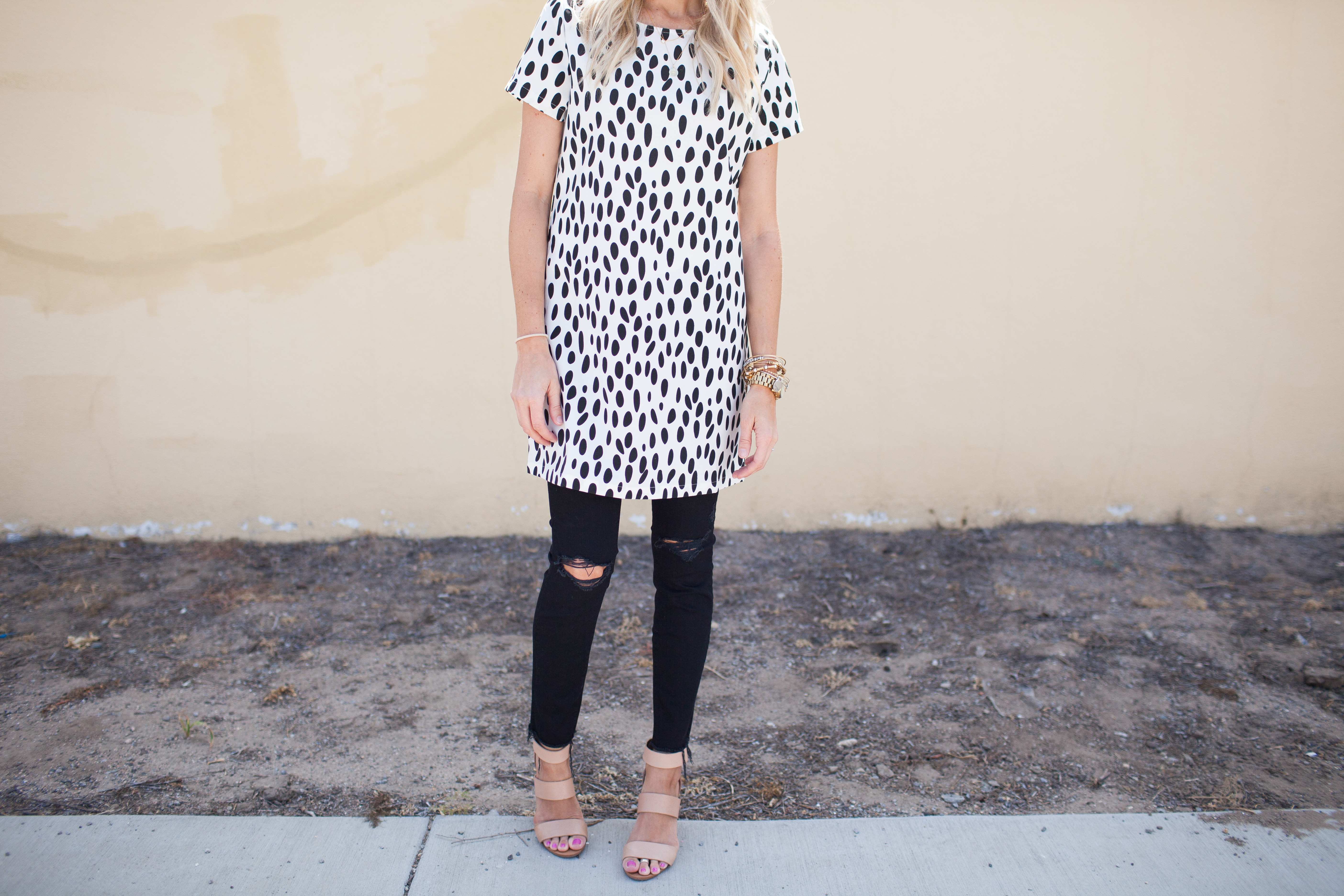 Also, I know some shorter dresses don’t work for everyone so I love to wear them as a tunic paired with some denim jeans (these are only $37!!) is a great option and a great way to mix up your dresses or for sleeveless options pair with a denim jacket . I found this darling dalmatian tunic dress for under $35 and just had to share!!