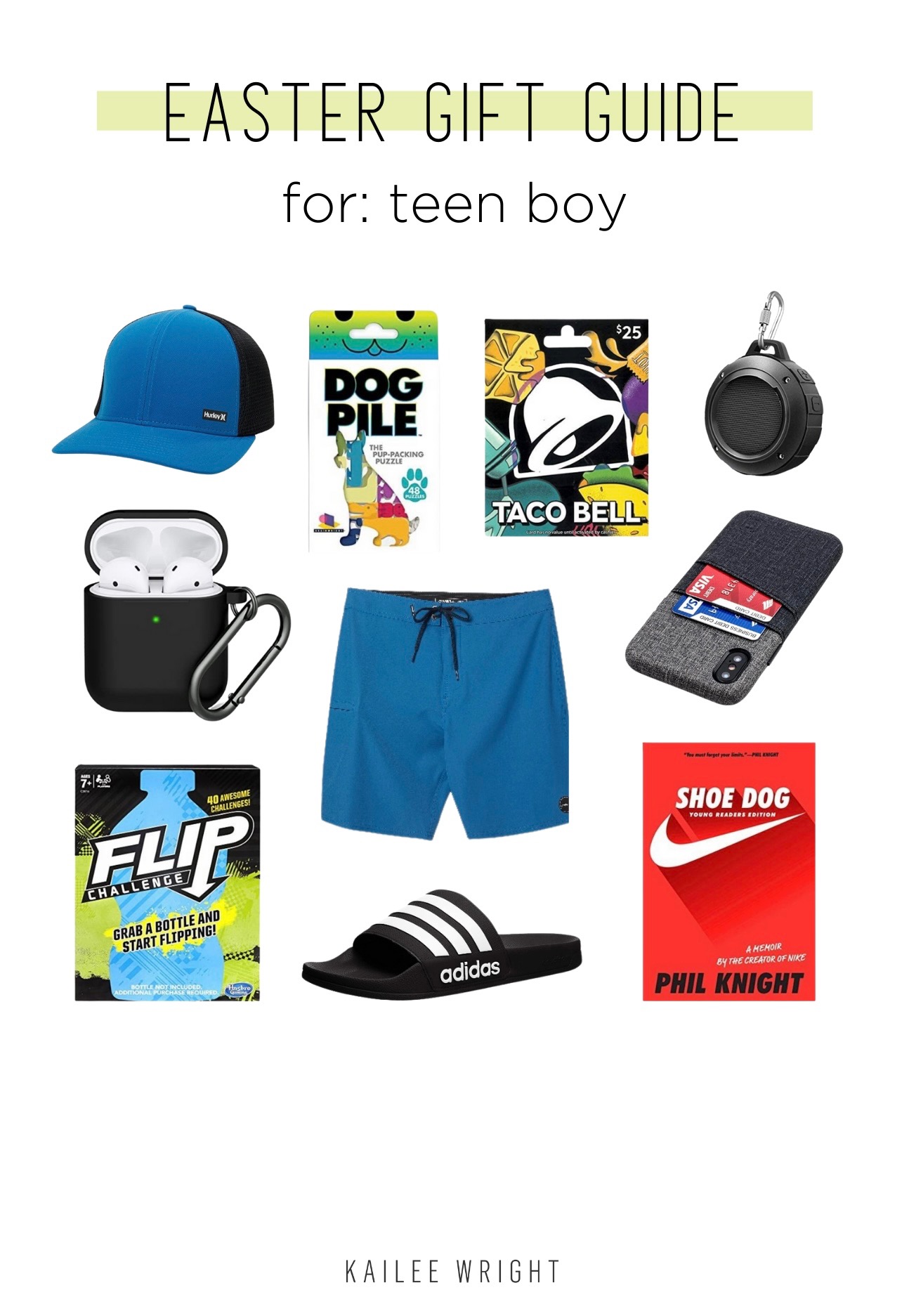 speaker | swimsuit | slides | phone case | airpod case | flip game | hat | book | gift card | dog pile