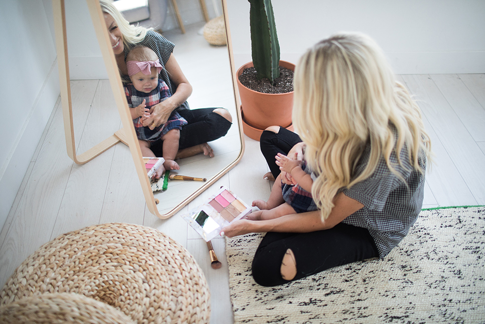 top + here | jeans + here || harper dress (similar) + headband || mirror (similar) | rug (similar) | poufs (similar + here) || makeup