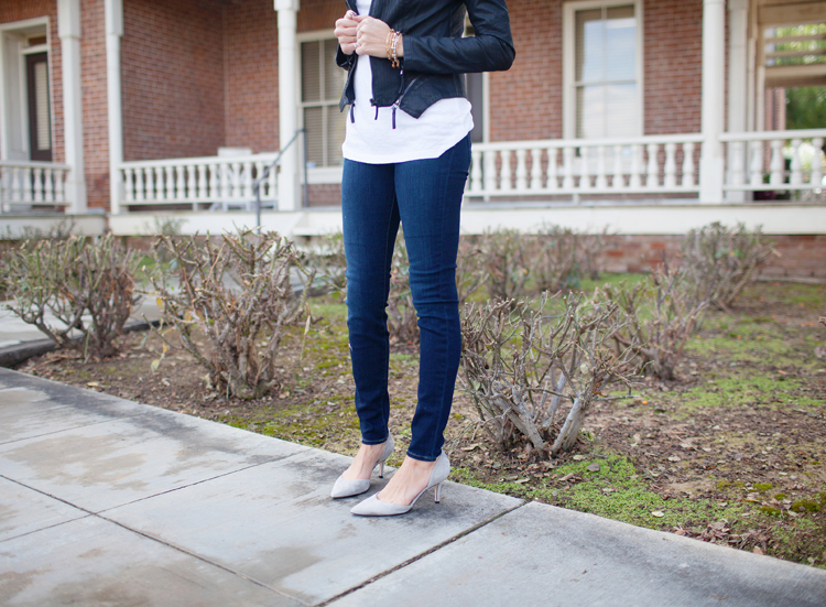 - black leather jacket: this is a must have and now is the time to grab one because most stores have all their coats and jackets on sale! Trust me I found the most fabulous leather jacket a few years back in the dead of summer and didn’t buy it, because it was 100 degrees outside. (insert kicking myself) Anyway, you can wear this jacket with anything…joggers, jeans, a dress you name it! It’s just that extra piece to dress up your everyday t-shirt and jeans.