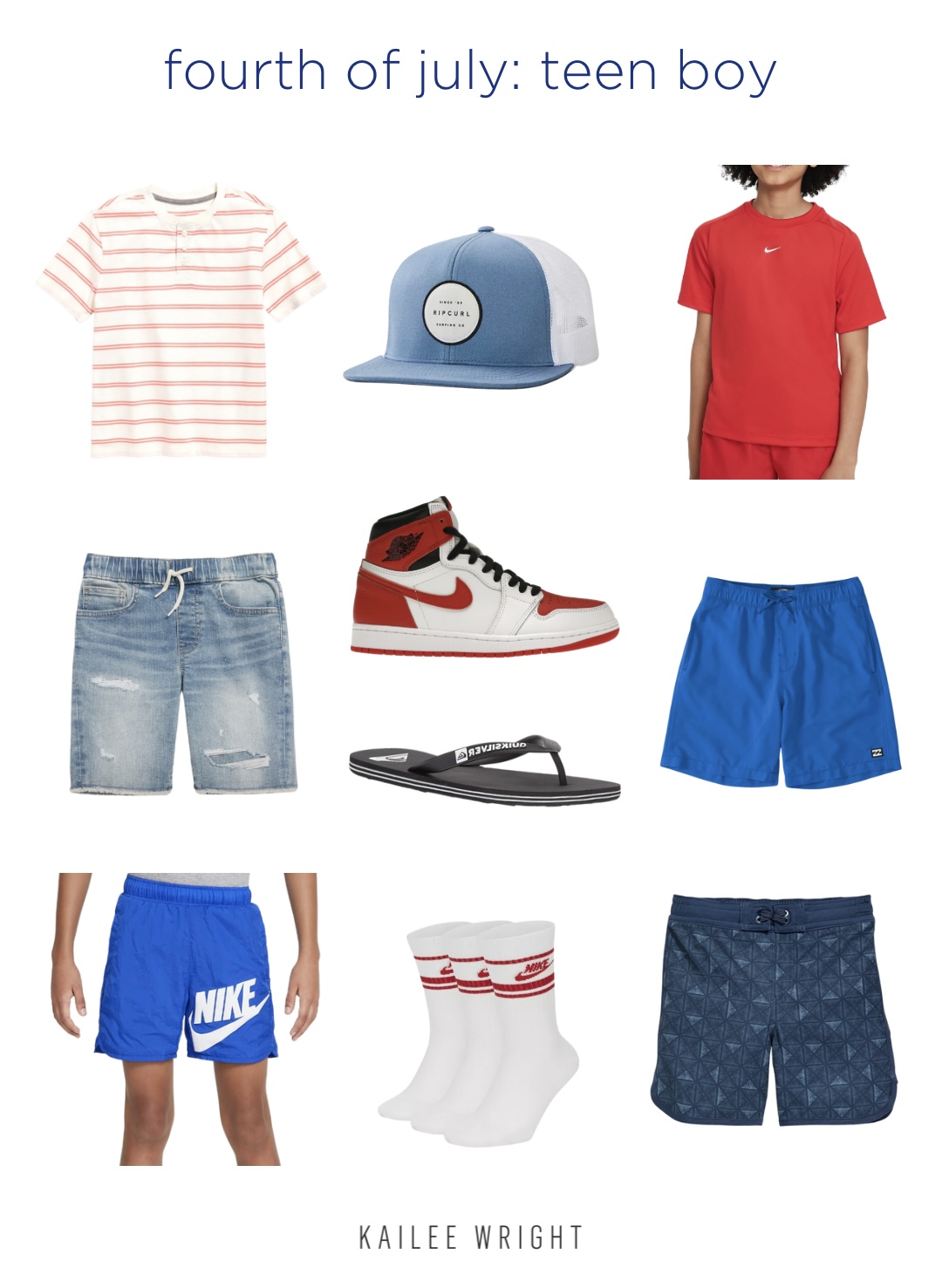 boys: white tee + blue tee + striped swim trunks + nike shirt + blue shorts + flip flops + red swim trunks
