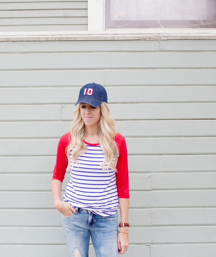 baseball tee + similar here + here (under $10) | favorite jeans | hat (similar here) | white converse | watch | necklace | bracelet + here