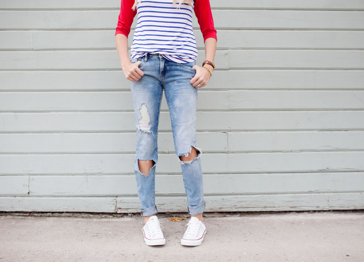 I always will gravitate to a comfortable + functional outfit when I’m out with my little people any day of the week! (which is usually always) Haha. I’ve learned after having four littles that that you don’t have to sacrifice fashion once you’ve got a van full of little people. Right now in this stage of my life I am nursing baby Houston, running little people back and fourth to soccer, dance, gym and school activities and more. So on crazy days like this I reach for my converse + jeans. Almost always. I also have to have a shirt that is easy to nurse in and won’t looked stretch out by the end of the day…so I usually go for a higher neck like this baseball tee. (please tell me you know what I mean when the your neckline is all stretched out by the end of the day)