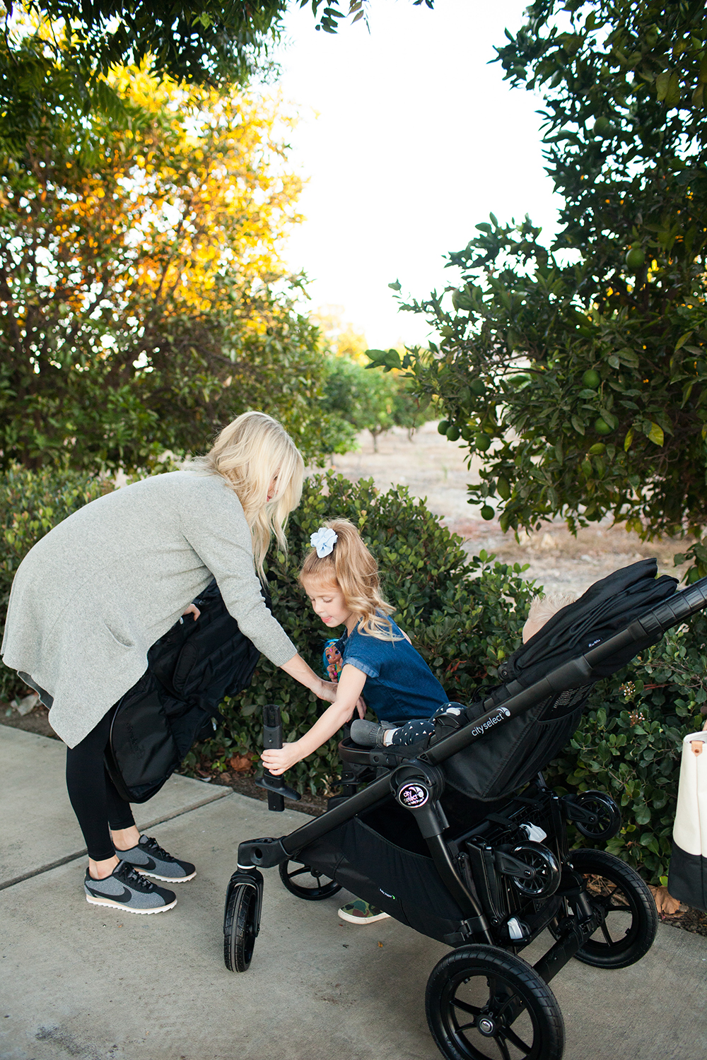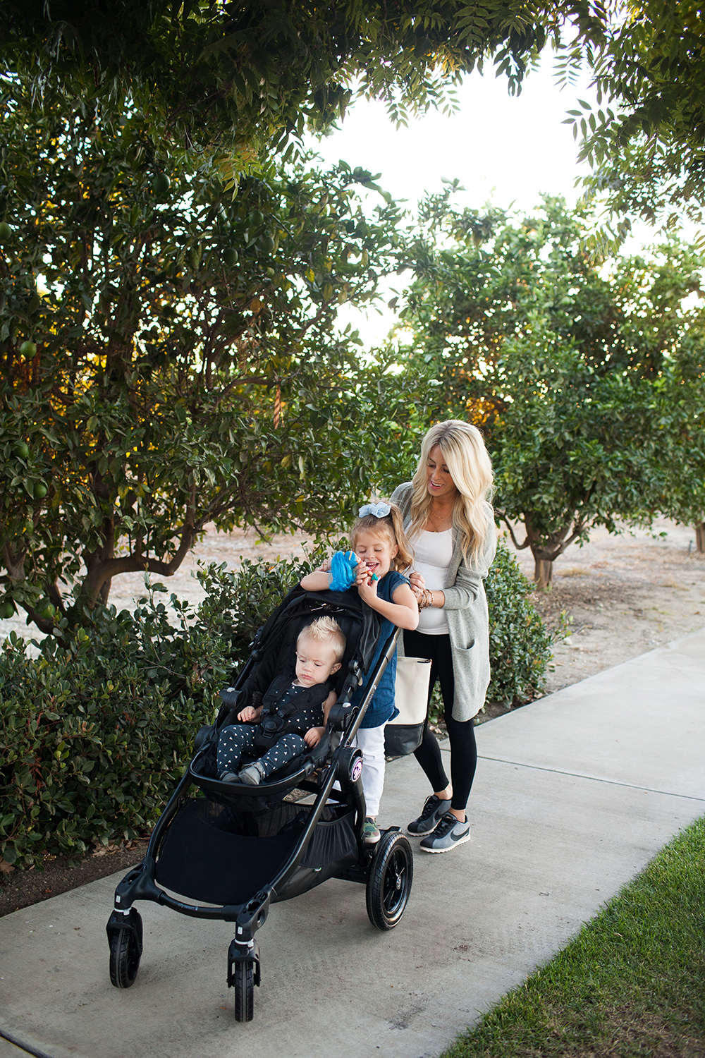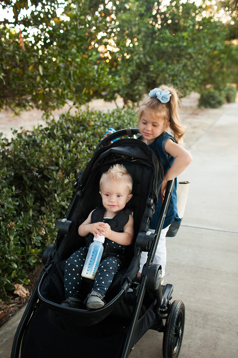 We took this double stroller out earlier this week with Hayden + Houston and we absolutely love it! With the city select, there are so many different options that you can work with. You can rotate the seats around so you can have them both front facing, parent facing, or even sibling facing. The stroller can be a single seater or a double seater and it has the best options for accessories! Hayden loved the Glider Board attachment and thought it was so fun to ride on. What’s also great is that it folds up really easy and is super simple!