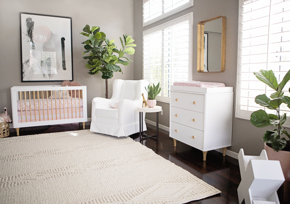skirt (sold out) similar | bodysuit (sold out) | glider | side table | rug | art | crib | dresser