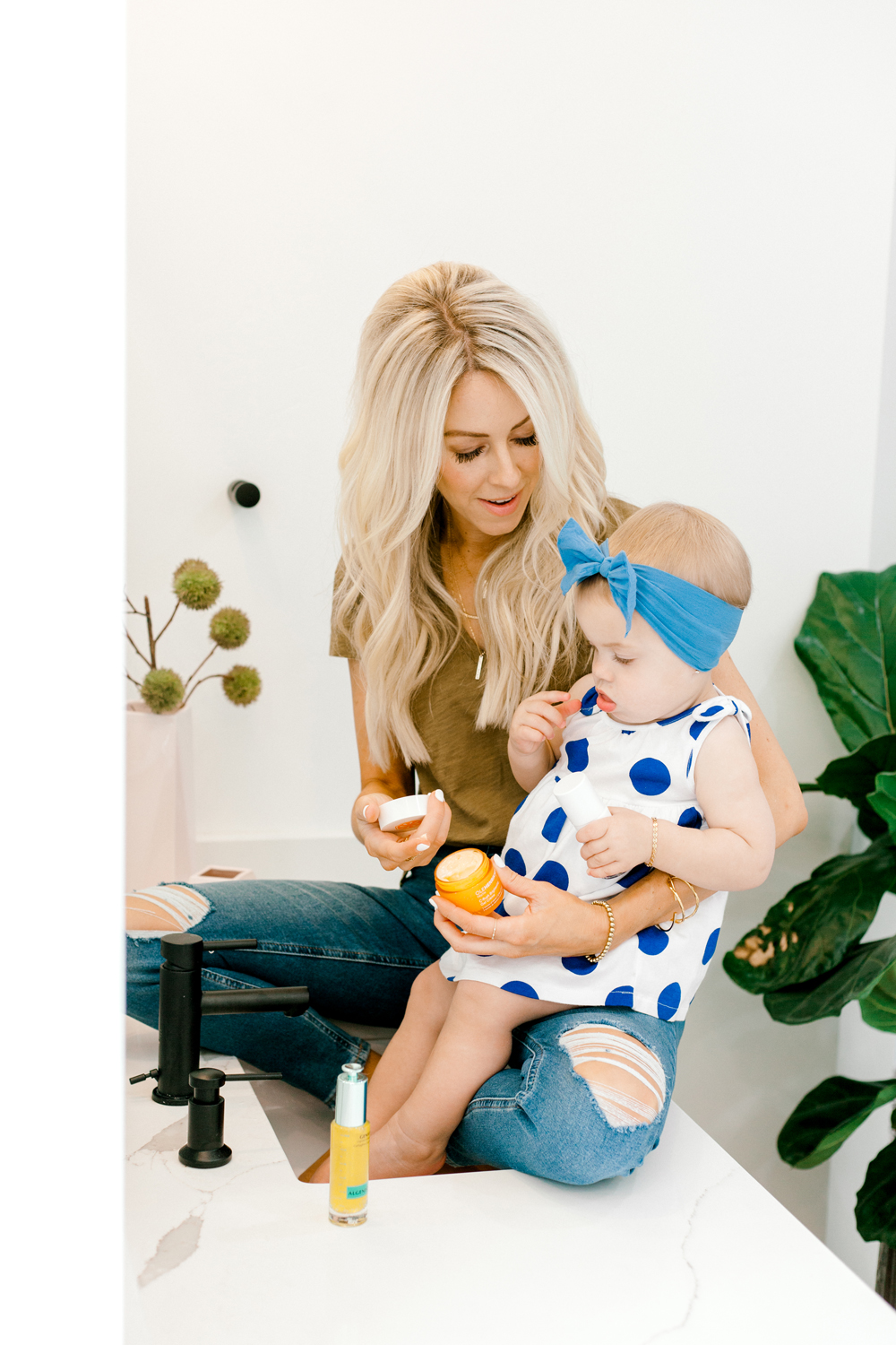 top | jeans | bracelet | disc necklace | crescent necklace | mama necklace | harper dress + headband