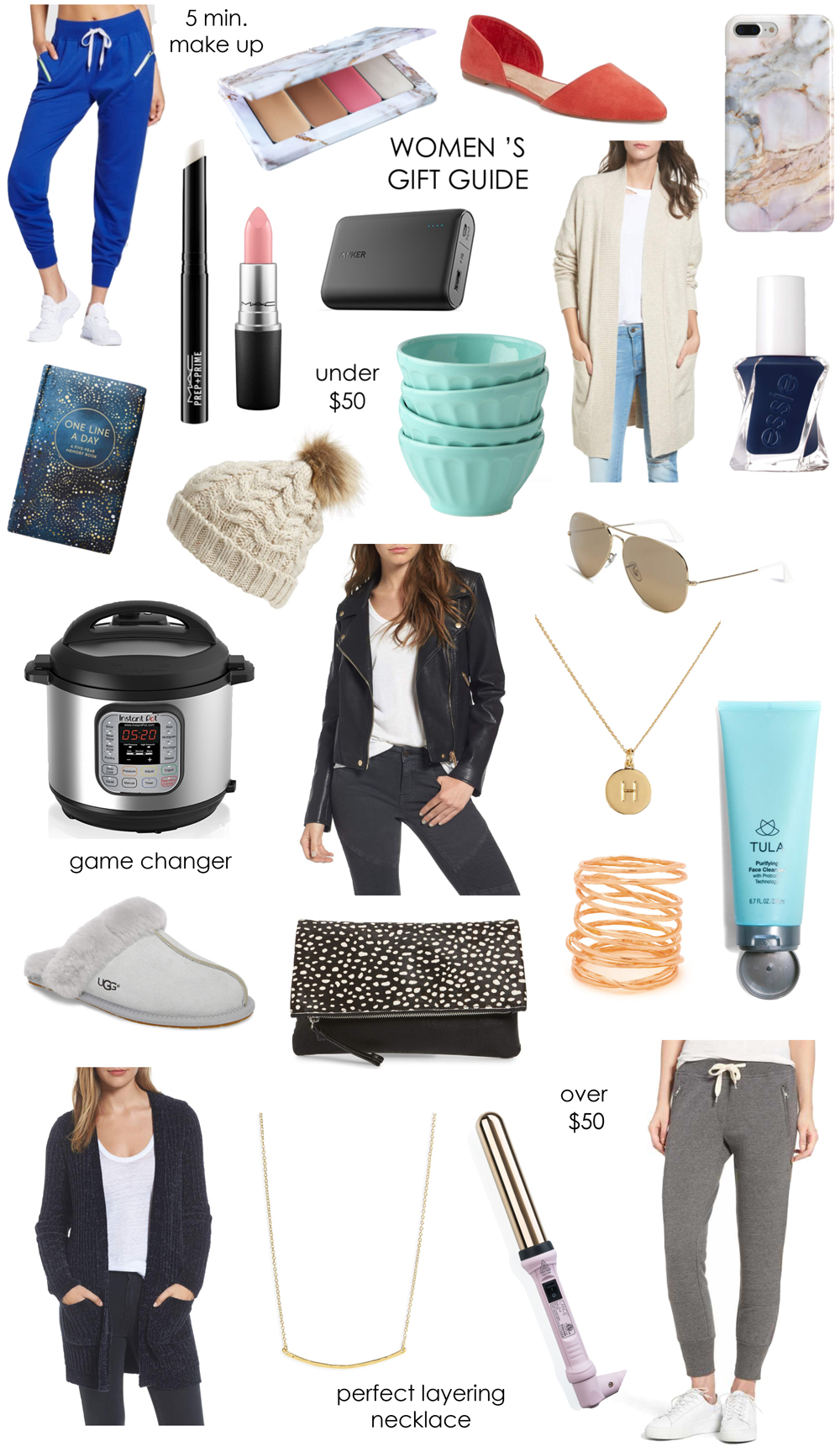 under $50: joggers | make up | flats | phone case | lip prime | lipstick | battery | cardigan | nail polish | journal | beanie | bowls