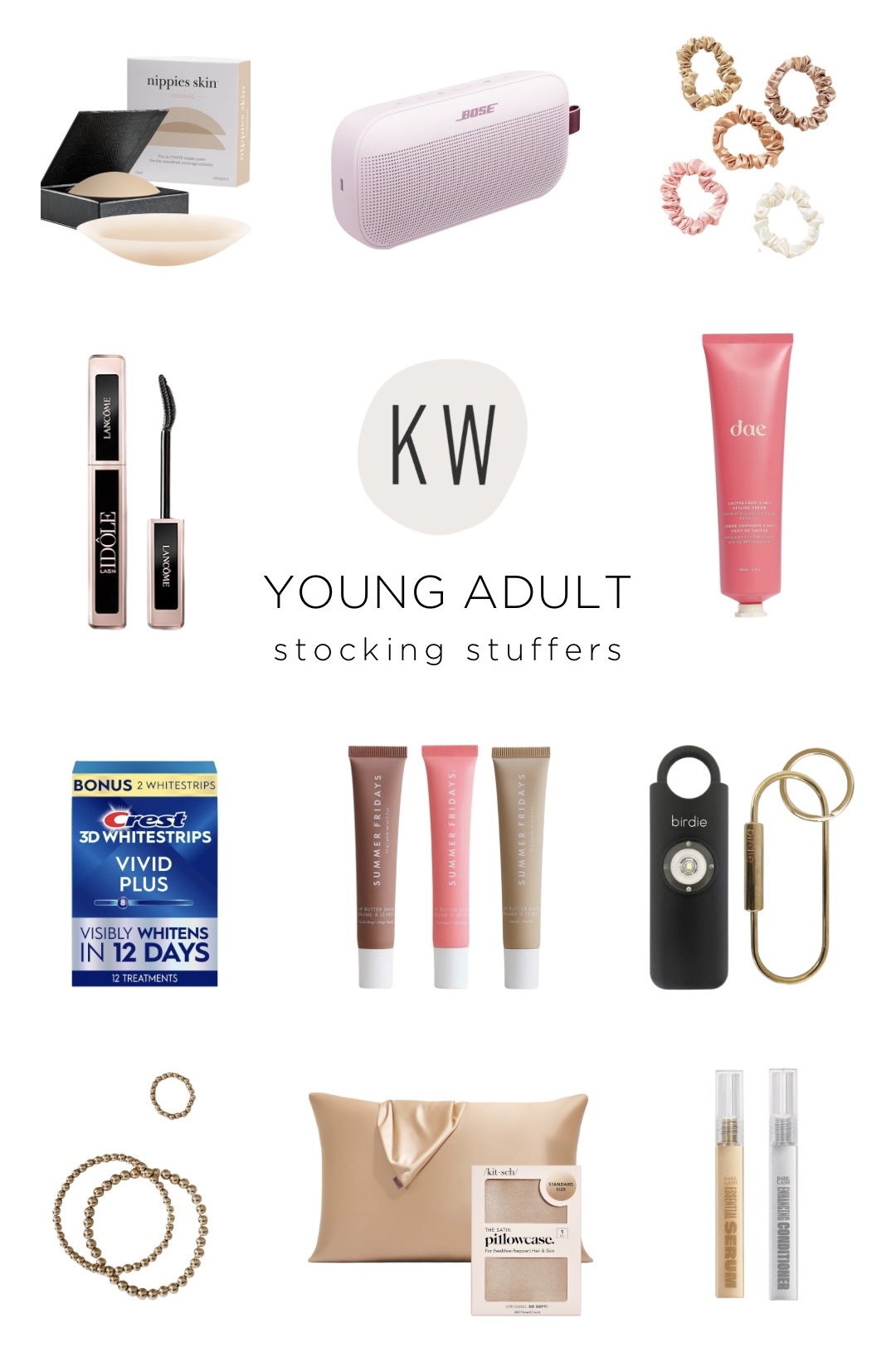 nippies + speaker + scrunchies + mascara + hair styling cream + whitening strips + summer friday lip gloss + birdie safety alarm + ring + bracelets + silk pillowcase + eyelash serum + conditioner