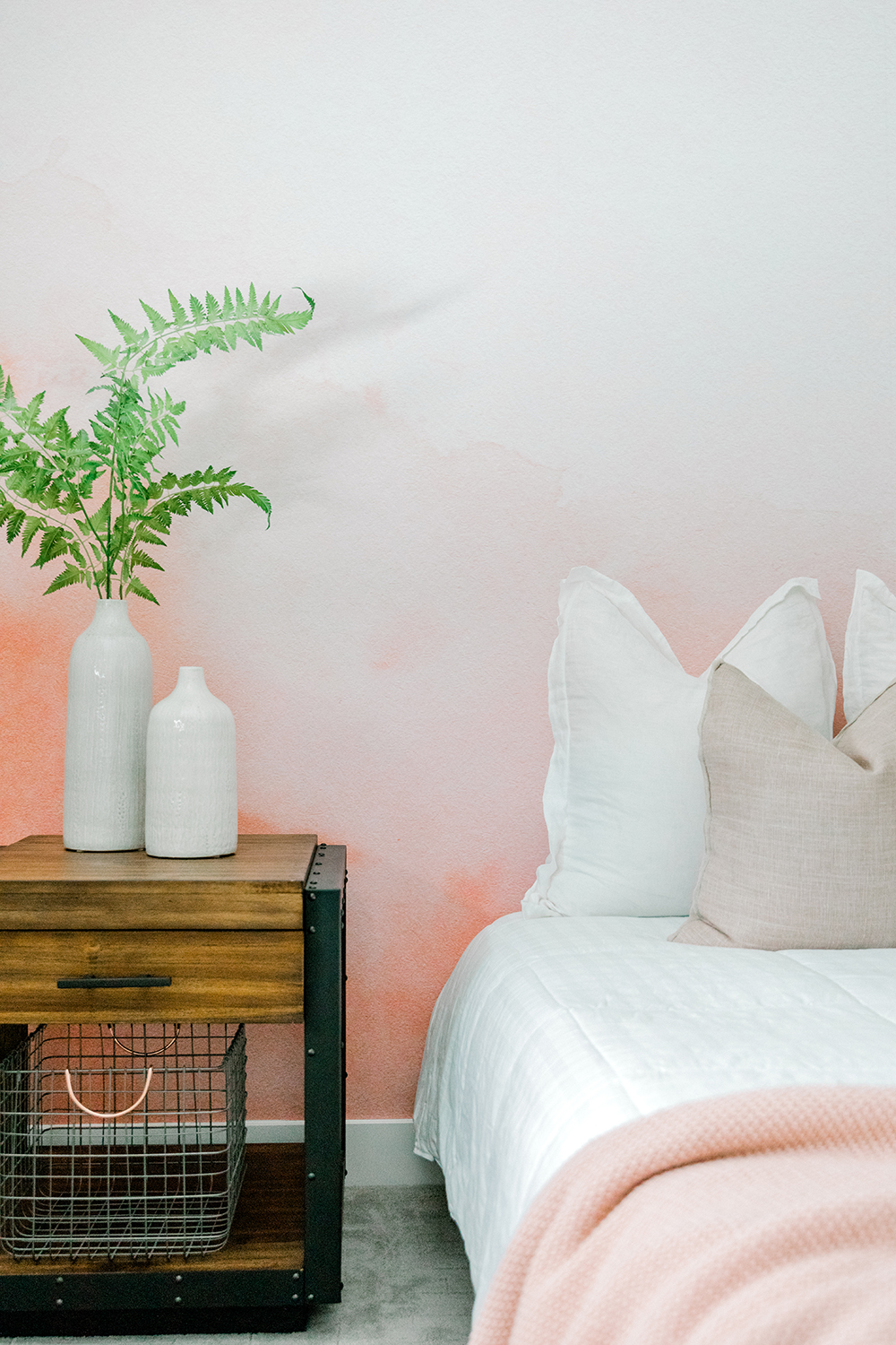 wallpaper || bed || bedding: white duvet + pink blanket + pillows || similar nightstand + similar vases