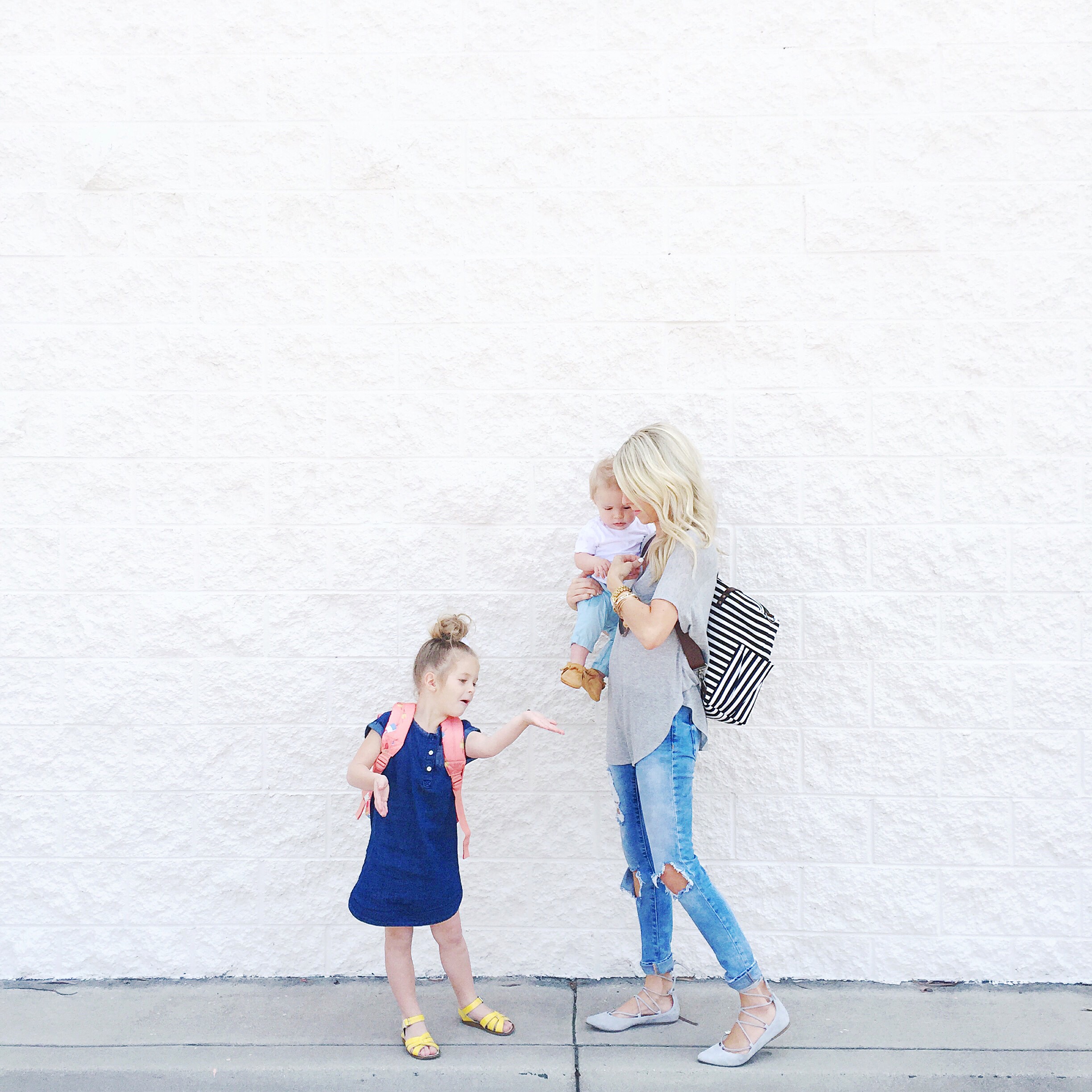Hayden: backpack | dress | sandals + Houston: tee | pants | mocc