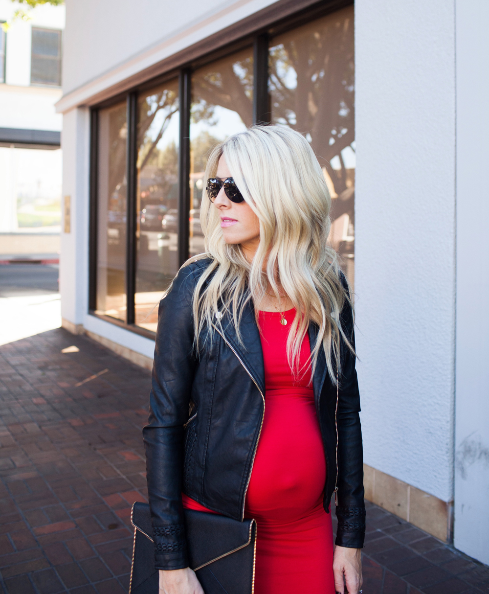 dress + non maternity here + here | leather jacket (only $98!) | sunnies + here | clutch