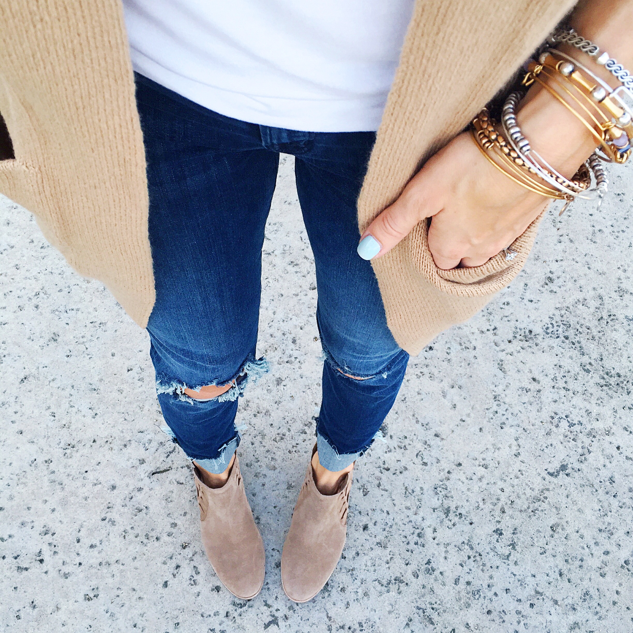 j-brand jeans | shirt | cardigan | booties | bracelets + here | purse (sold out) – similar