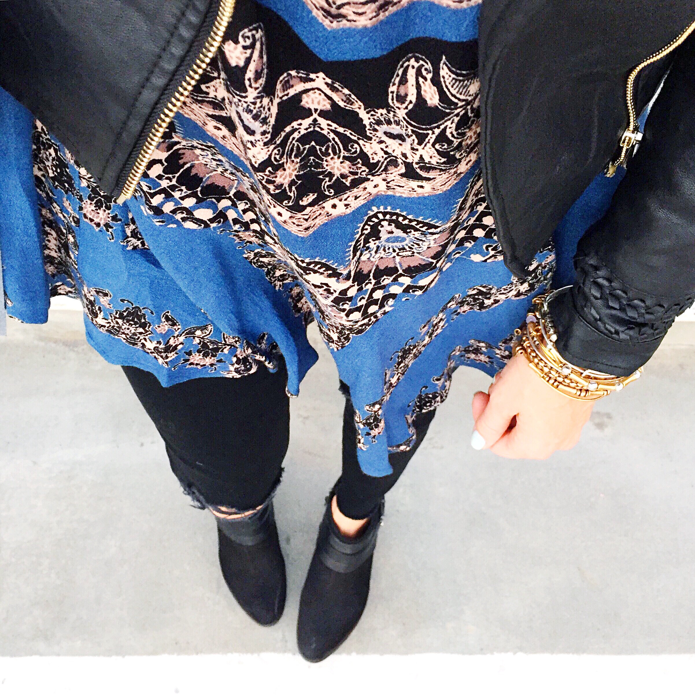 shirt | leather jacket | jeans | booties + similar | bracelets + here