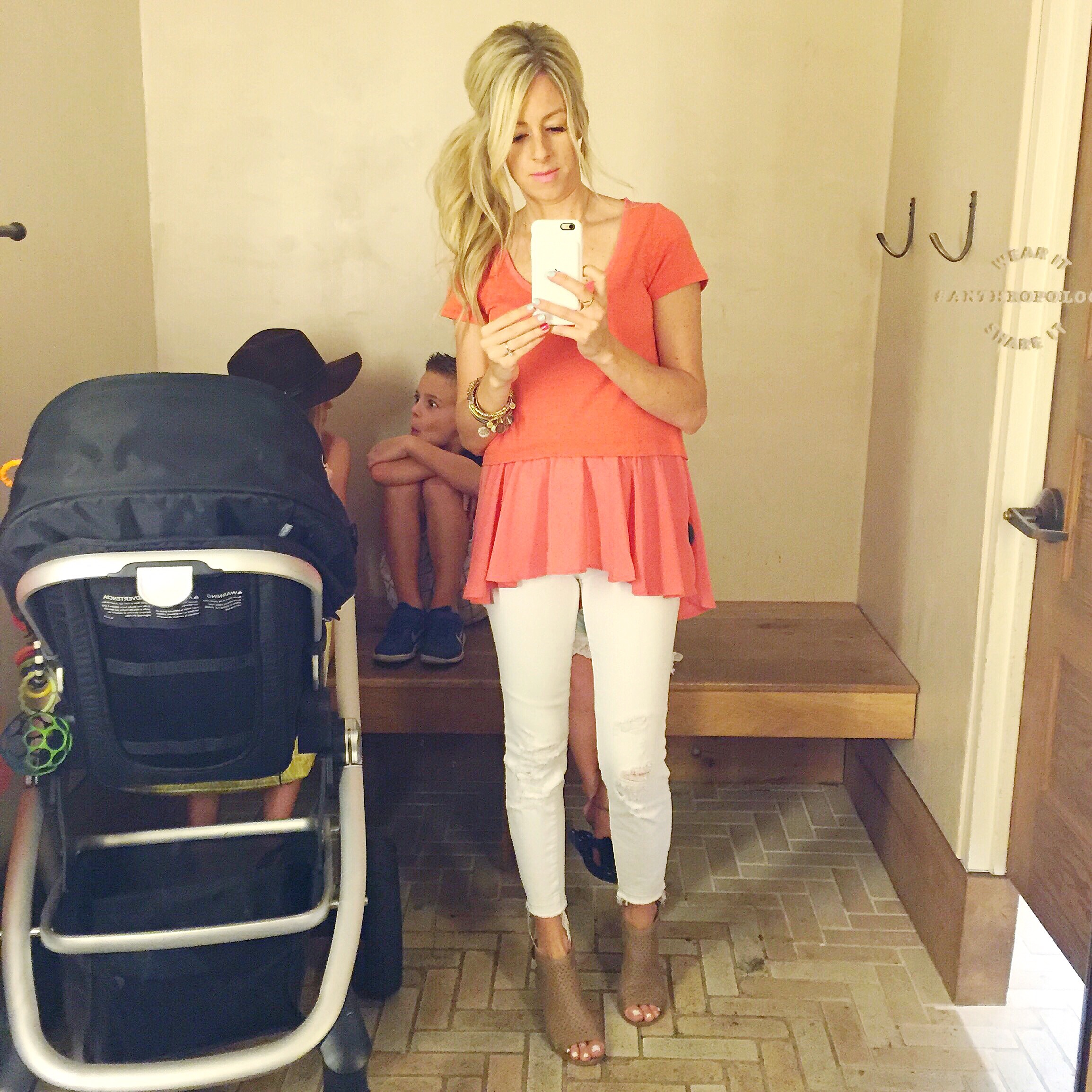 top (wearing an xs) | white denim | peep toe shoes | bracelets + here | stroller