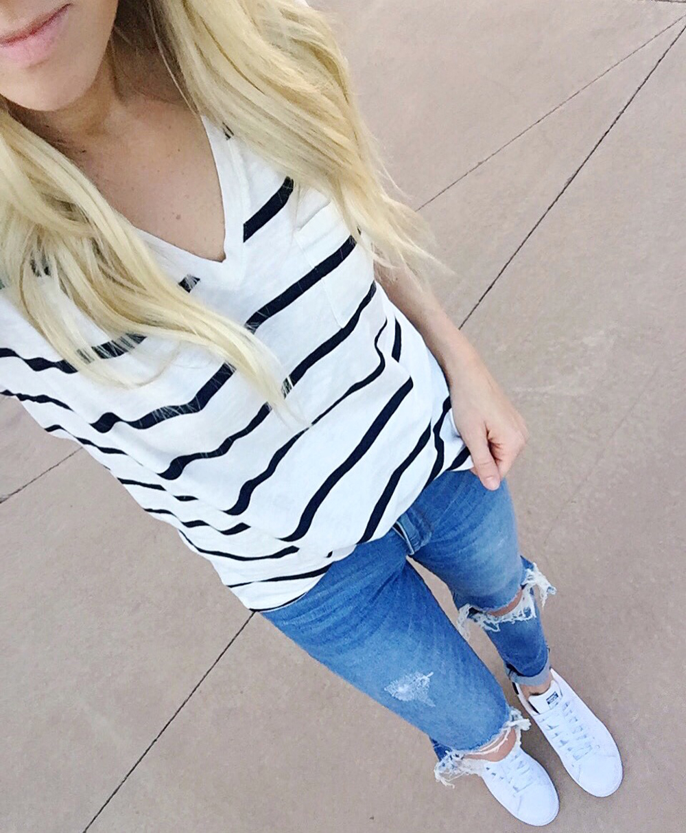 So my FAVORITE distressed jeans are finally back in stock!! I bought them last year and finally “semi” fit back into them. The sizes are going fast so if you’ve been looking for a pair snag these ones. I can’t wait to share Harpers blessing pictures — because we found the dress I was blessed in as a baby and Harper ended up wearing the same dress!! I was dying. Thanks for always stopping by + for all your support!! Love ya!!