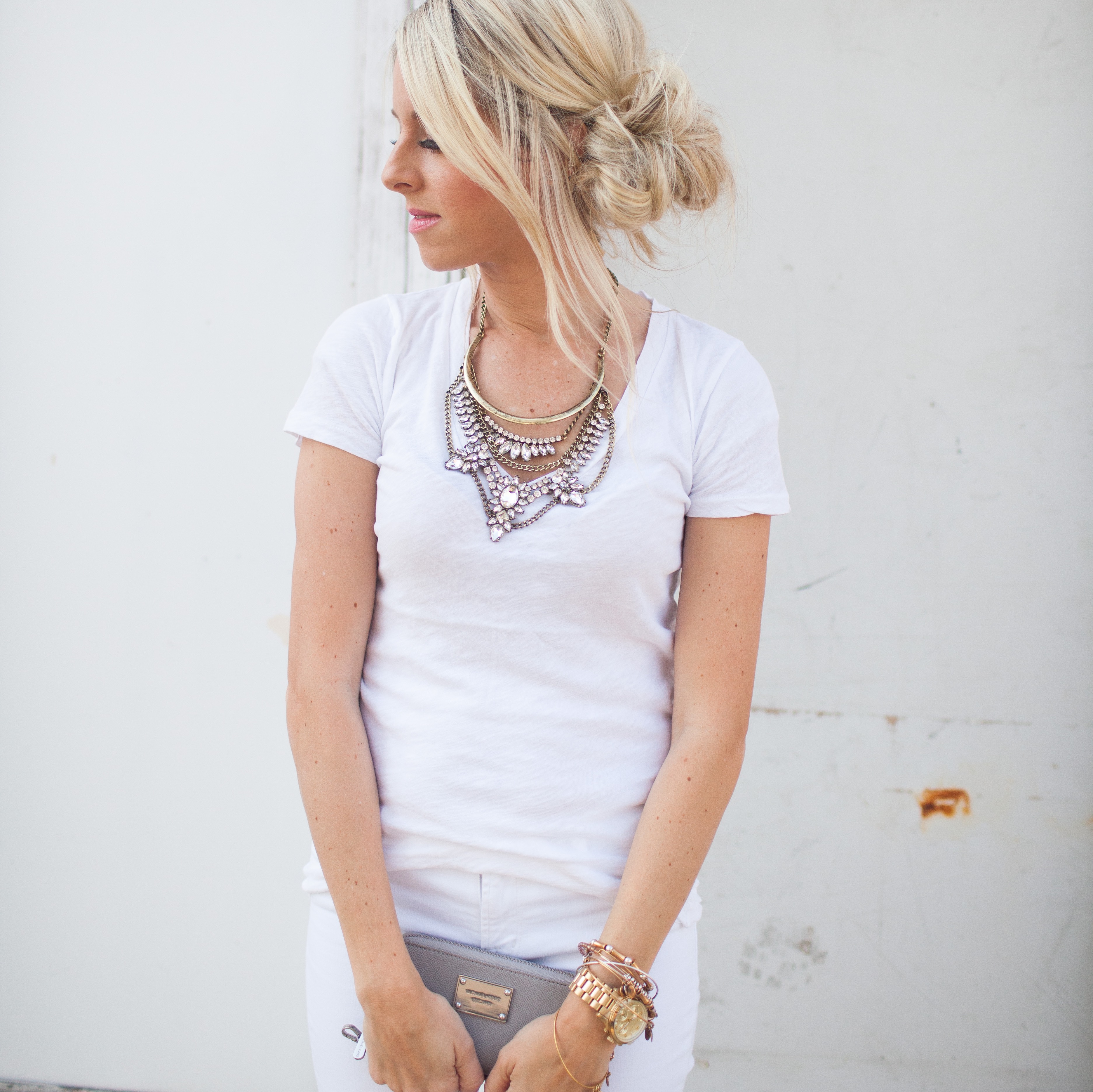 white tee | white denim | necklace + similar | watch | bracelets + here | clutch
