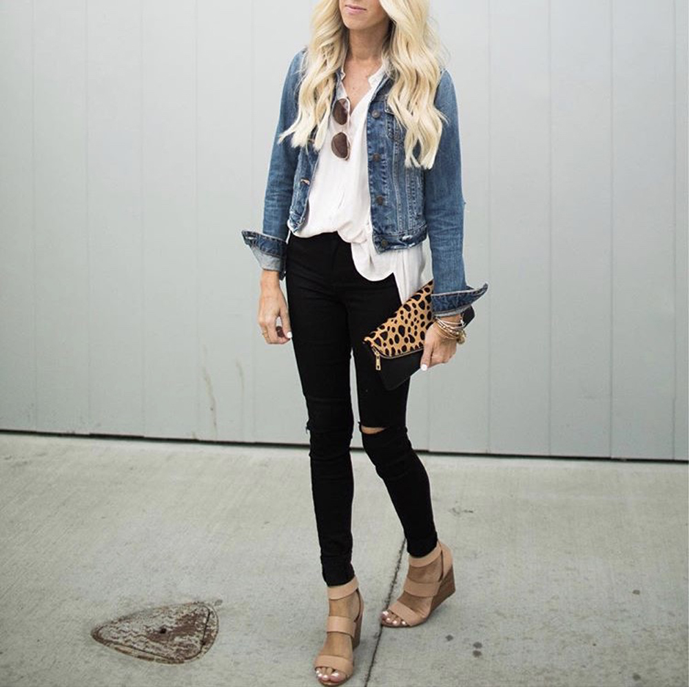 jacket | top + here | jeans | wedges (similar) | clutch | sunnies