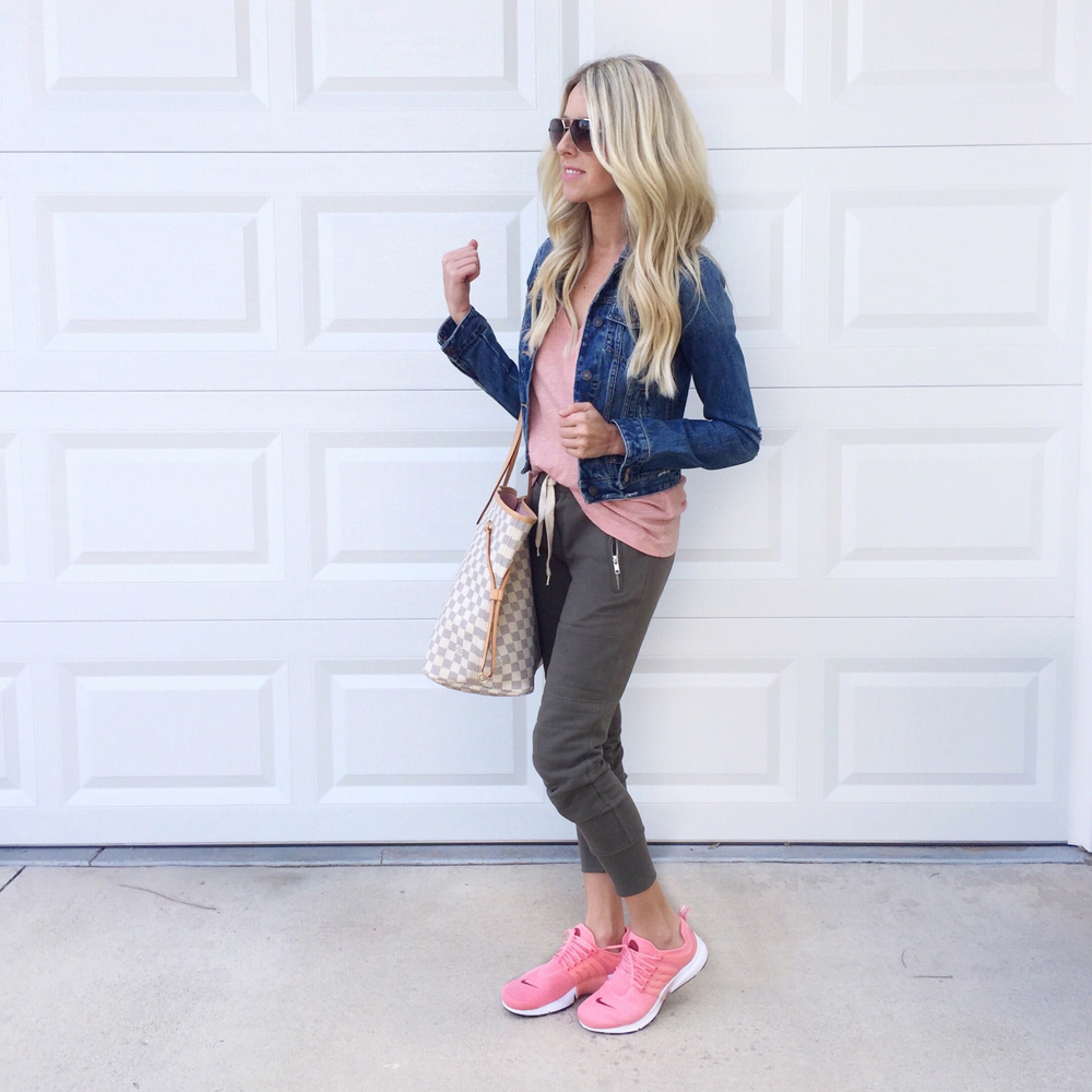 jacket | t-shirt | joggers | tennies | purse | sunnies