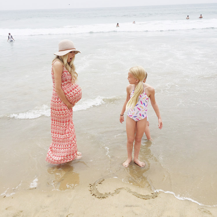 So Joe finally had a full day off…in lets say weeks + we knew exactly what we wanted to do…have a BEACH DAY!! It had been so long since we had gone with just our little family to the beach + it was just what we needed before baby comes in 8 days! We headed down to Newport Beach this time, as we like to switch it up between all the fun beaches down here. The weather was perfect, the beach was not to crowded and the kids were pretty good…with only one or two melt downs. Haha. The older kids love to boogie board, and Hayden still hates to touch the water. Right before we left I kinda drug her in (nicely of course) and within five minutes we couldn’t get her out of the water. I swear that’s how it always goes. I hope you guys have a fabulous Wednesday and thank you so much for stopping by our little space here!!