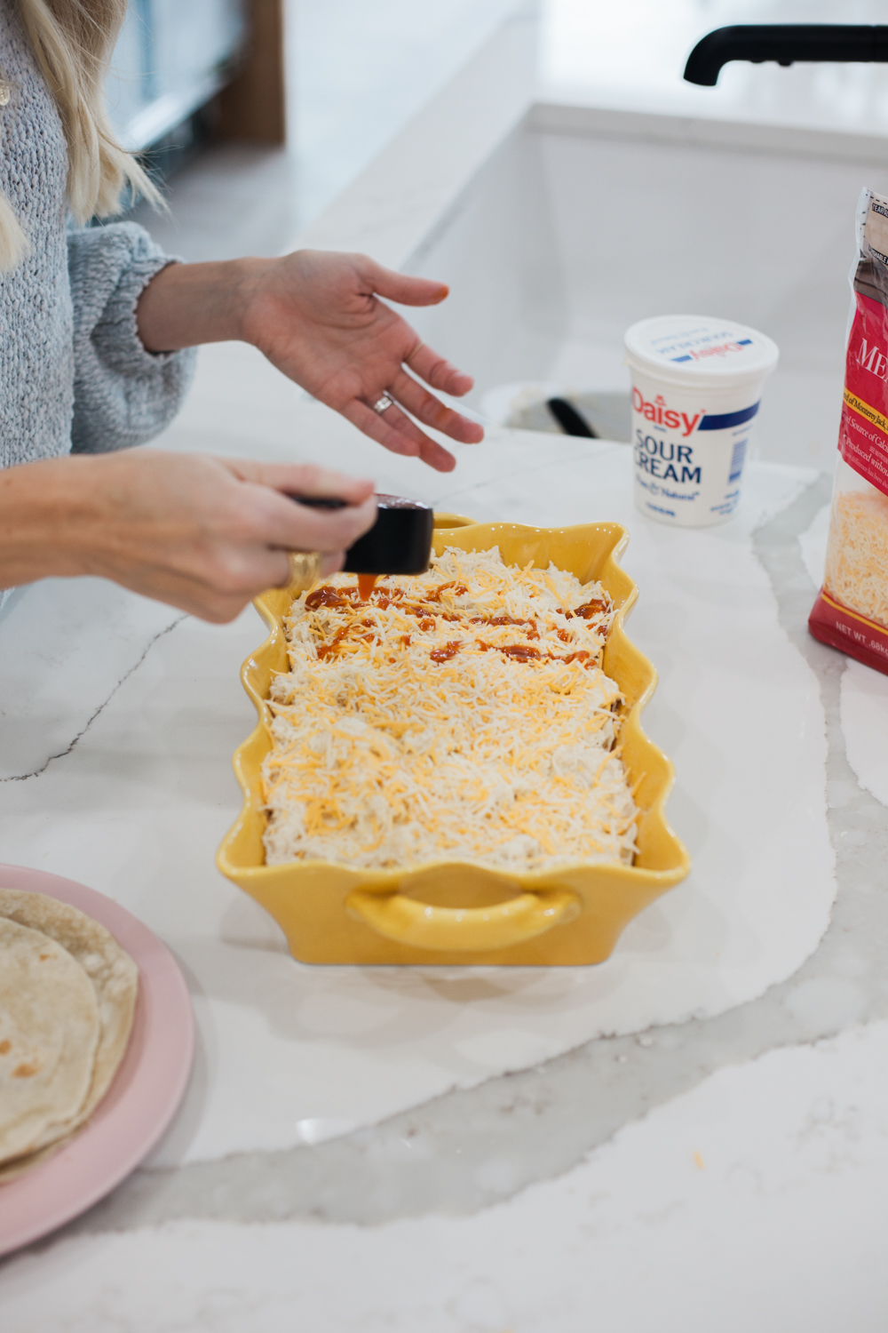Next, add a layer of the chicken mixture on top of the tortillas, followed with a layer of both cheeses. Then drizzle half of the enchilada sauce.