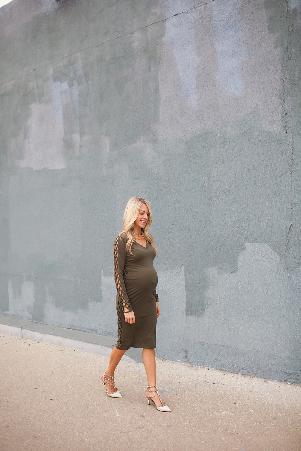 As you all may already know, one of my favorite things to wear while pregnant are dresses. They are so easy to wear while pregnant and a lot of the time I can find non-maternity dresses that stretch really well with the belly + will still be great to wear after baby. This olive dress is non-maternity + fits so perfect with my ever growing baby belly. Plus, the little extra detail on the sleeve makes all the difference! It’s super stretchy so I don’t feel like I’m suffocating, but it bounces back easily + keeps it’s shape so it doesn’t look stretched out after I’ve worn it! I am loving this color for the fall and winter!! Olive goes with just about everything in your closet – from browns, to blacks, even pink and tan.