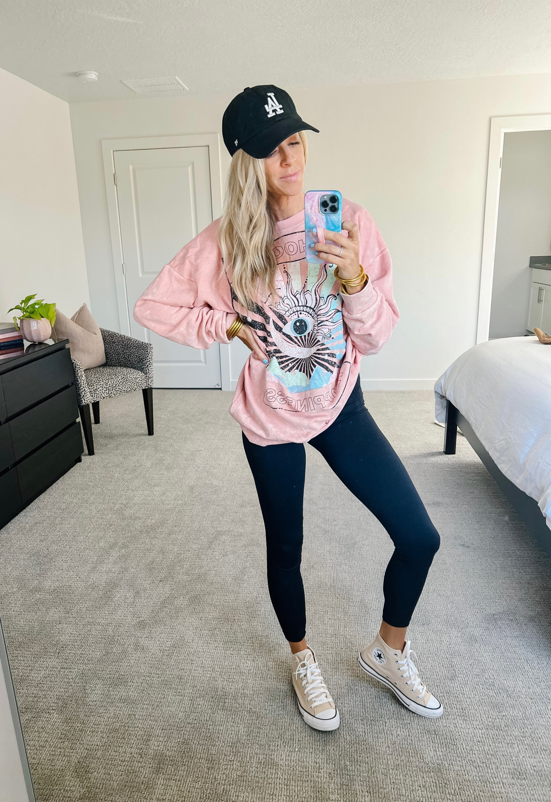 Everyone needs a pair of black leggings for fall! I love that you can dress them up or down. I paired these $13 black leggings with this graphic long sleeve tee and I love how it looks!