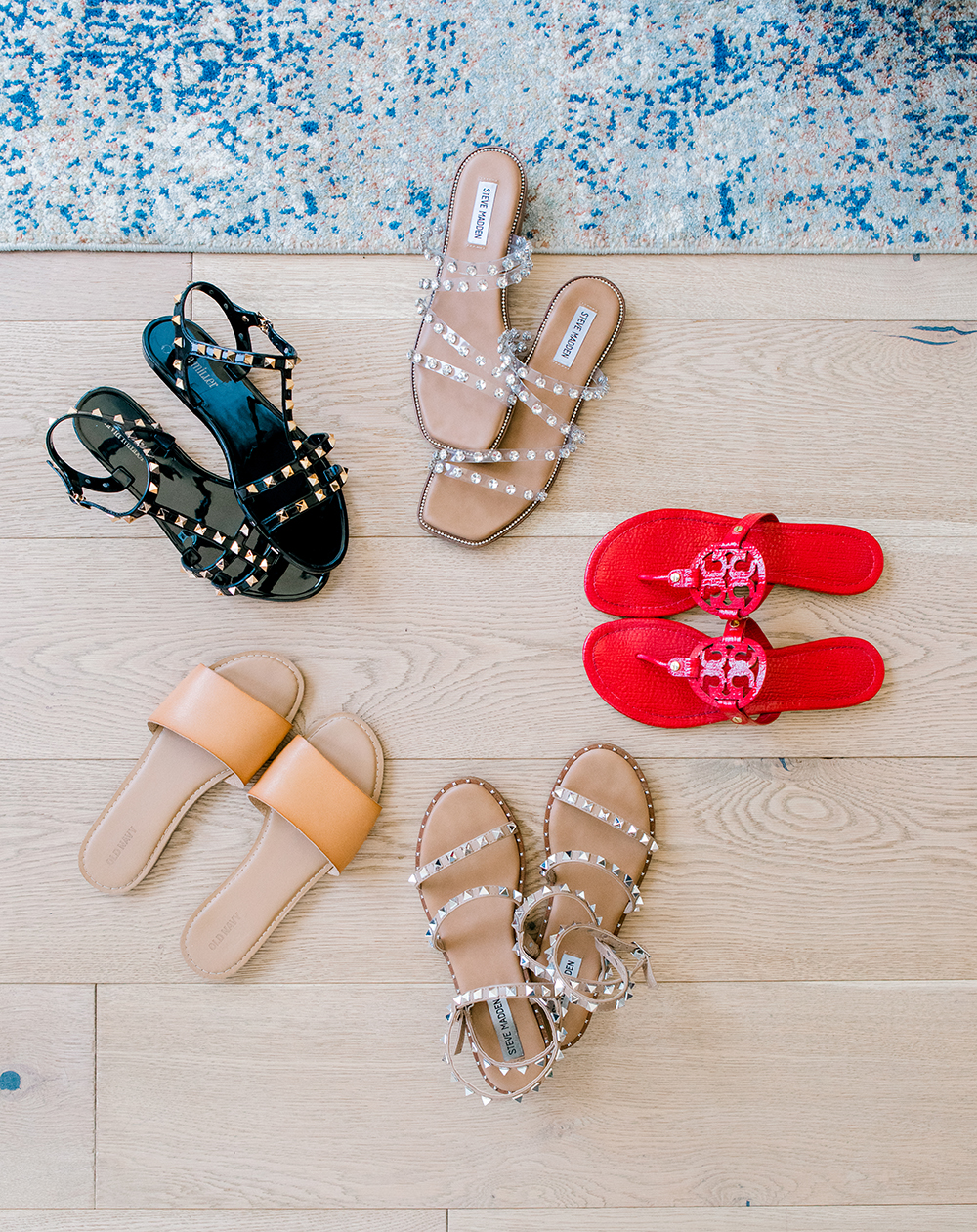 red flip flops + similar | tan studded | tan slides + similar | black studded | clear rhinestoned
