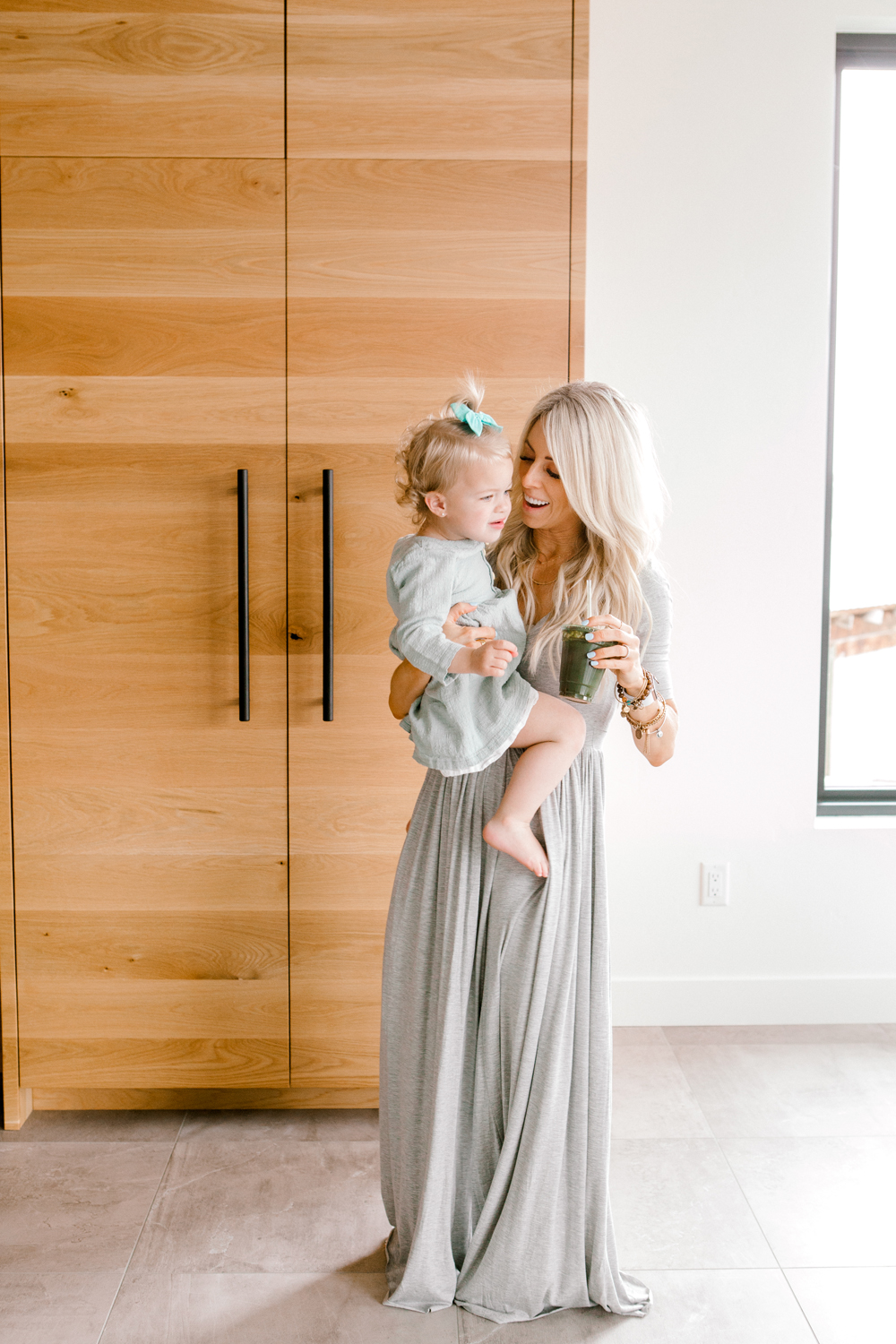 my jumpsuit || harper’s dress + bow || the very best protein bar (code below) + green shake