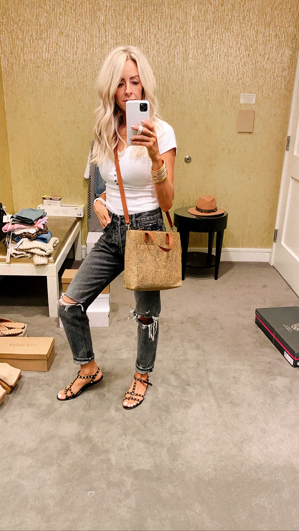 similar top | similar jeans | sandals | bag | gold + rose gold bracelets