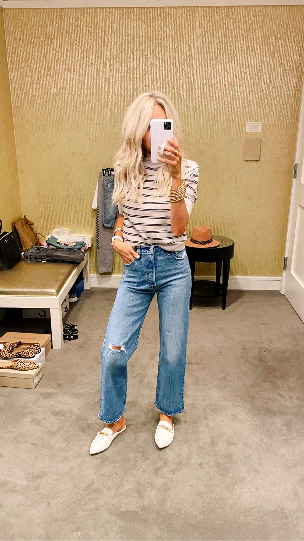 my top | similar jeans | similar slides | hat | bracelets