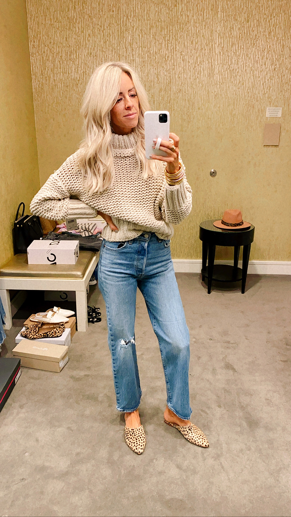 sweater | jeans | slides | gold + rose gold bracelets