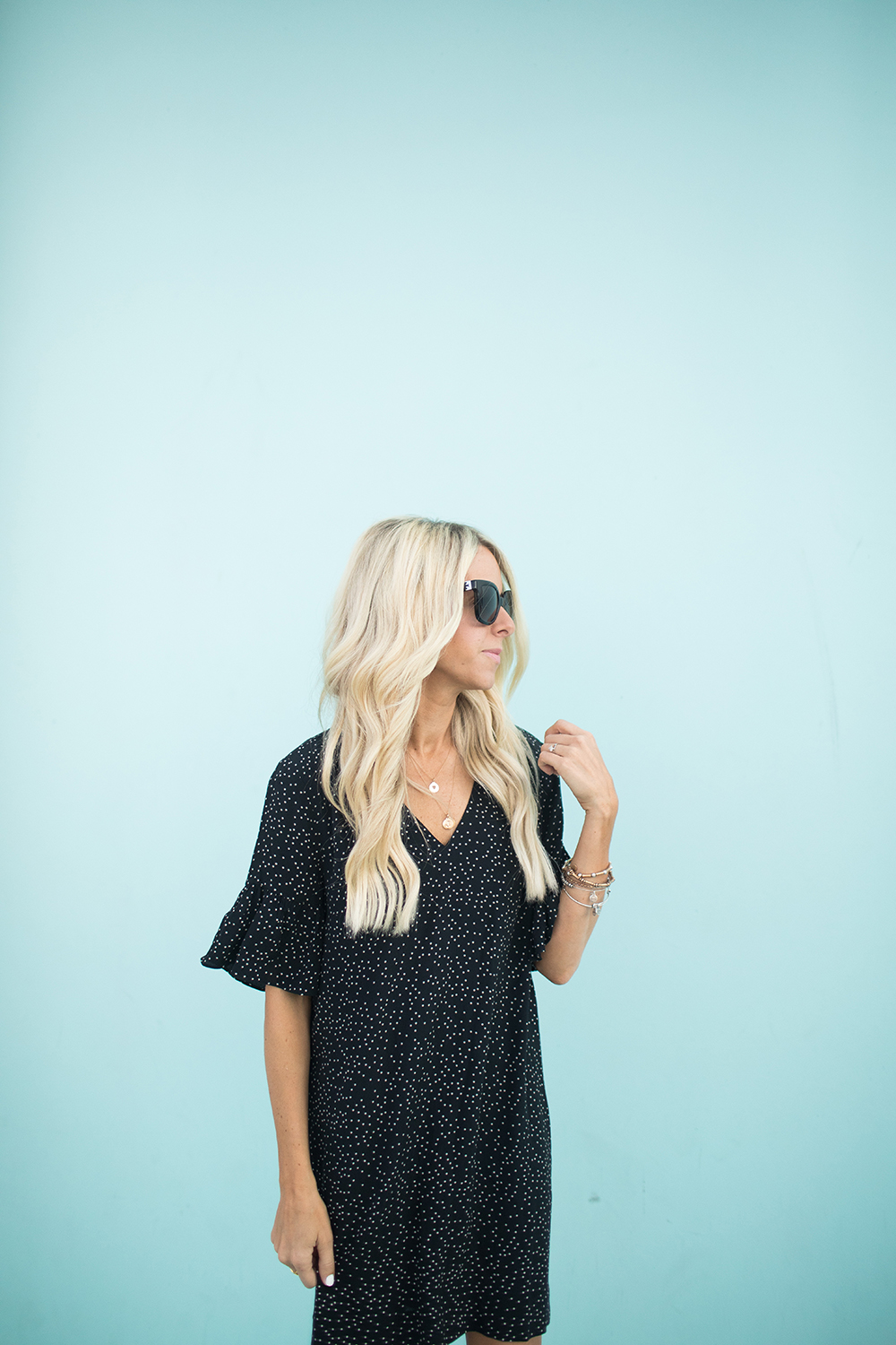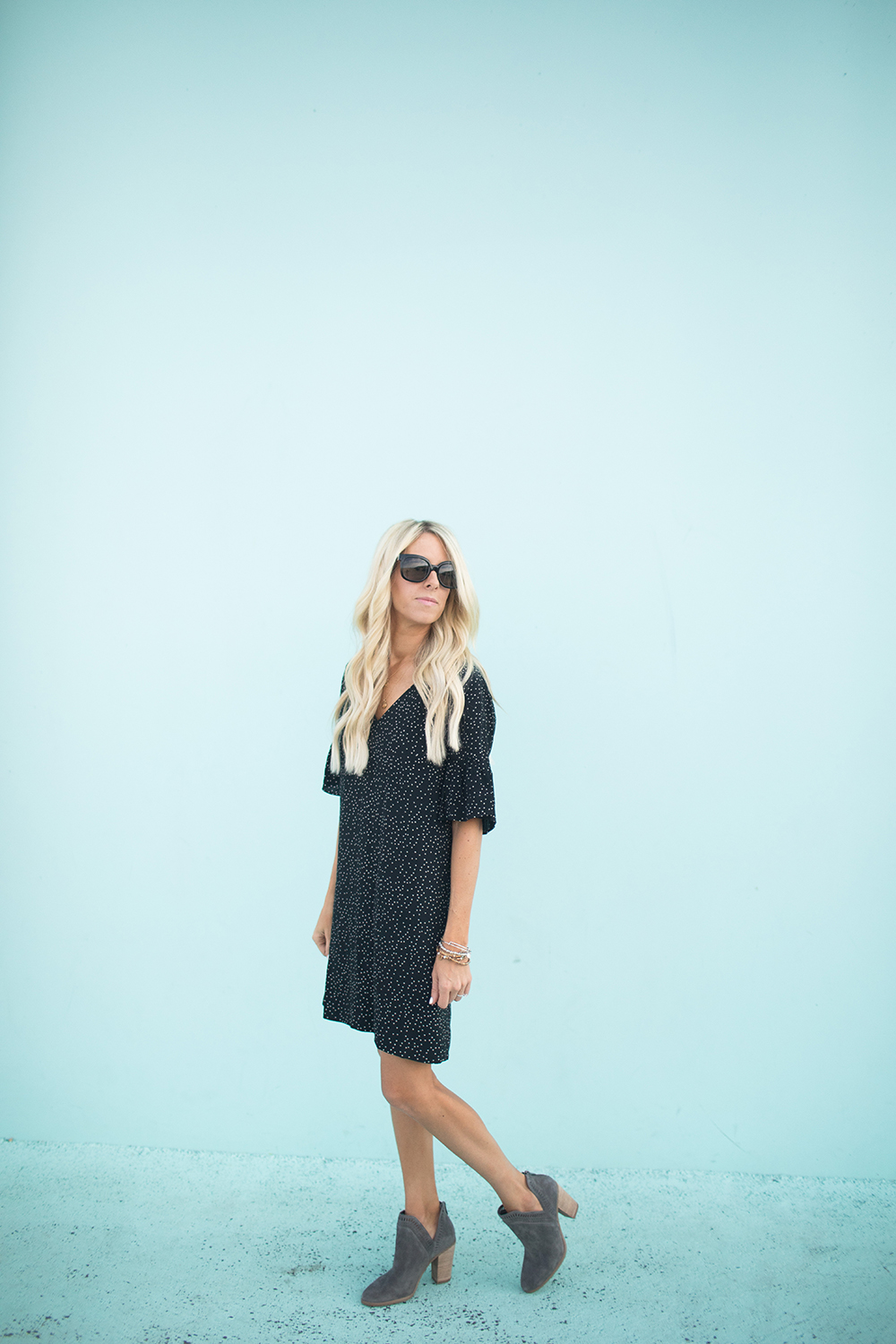 sunnies | dress | booties + similar | bracelets | necklace