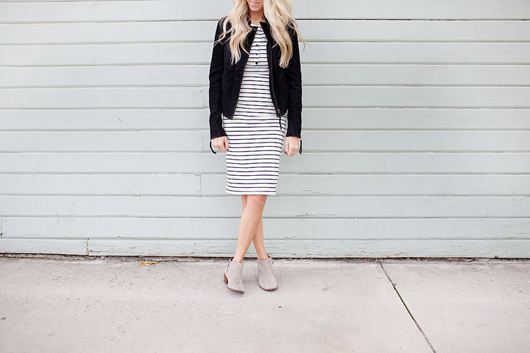 I love good staple piece like this striped dress, that I can wear multiply times styled different ways. I seriously have worn this dress at least three times this week…running errands with my New Balances + denim jacket and all four of my little people in tow. Once with my favorite grey booties for a target run by myself (which felt like a vacation) haha, and then all I did was just add this black faux leather jacket to dress up the look for a girls night out!! Now go out and get yourself that great staple piece and wear it constantly!! Happy Friday!!