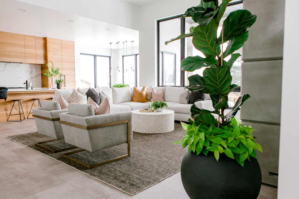couch + pillows + chairs | rug | coffee table | black round planter + fiddle leaf | tile