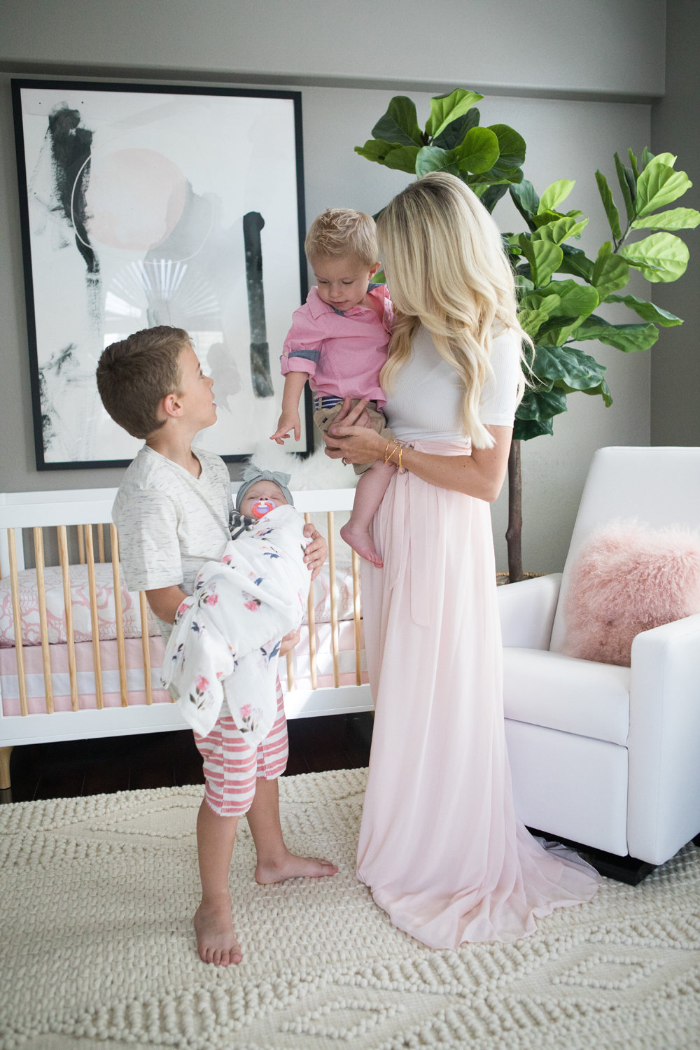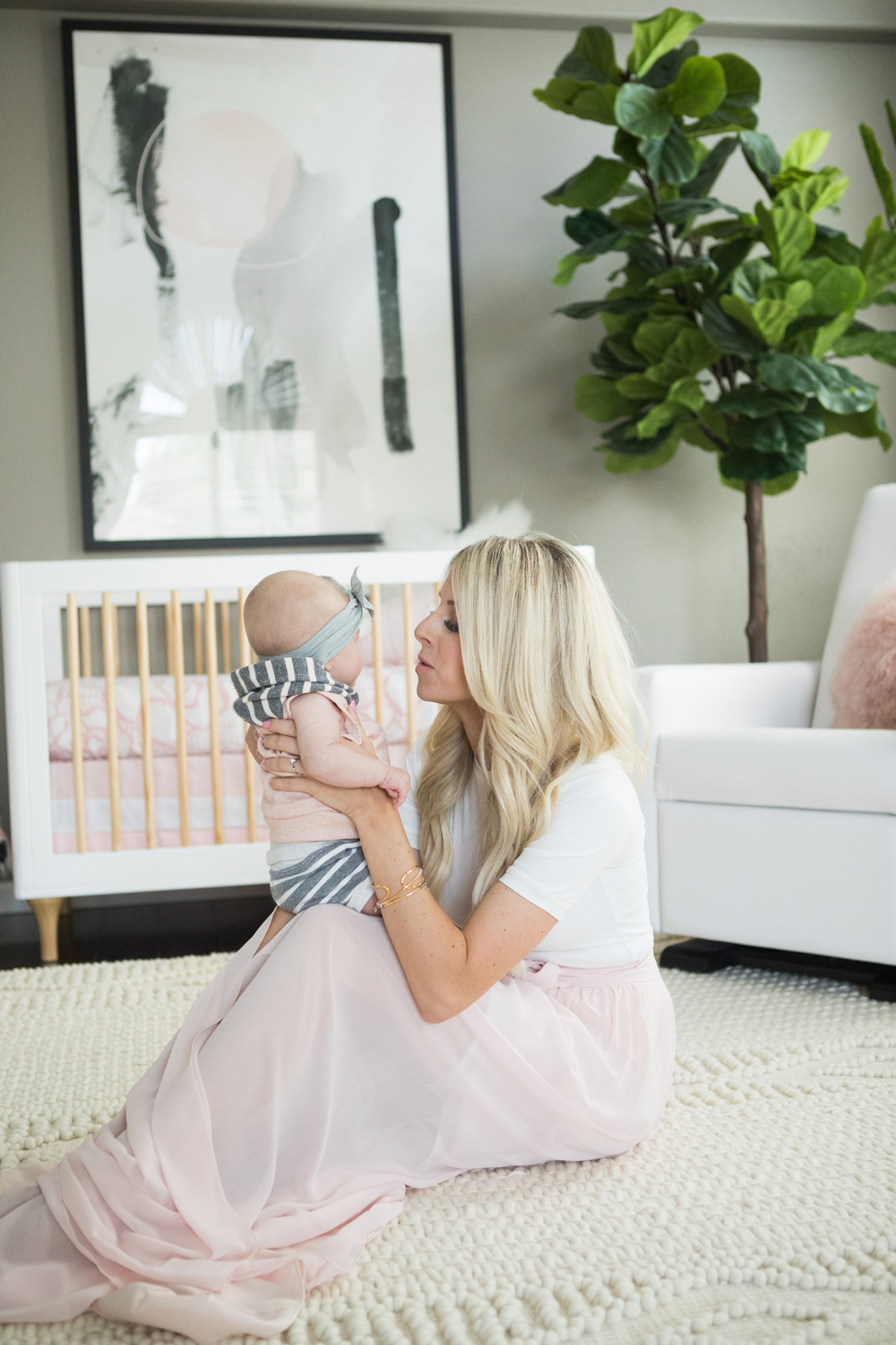 glider | crib | crib bedding | pink fur pillow | ivory fur pillow | pattern pillow | wool rug | baskets | ceiling light | wall art | tree | side table | small pink pot | pink flamingo | gold giraffe