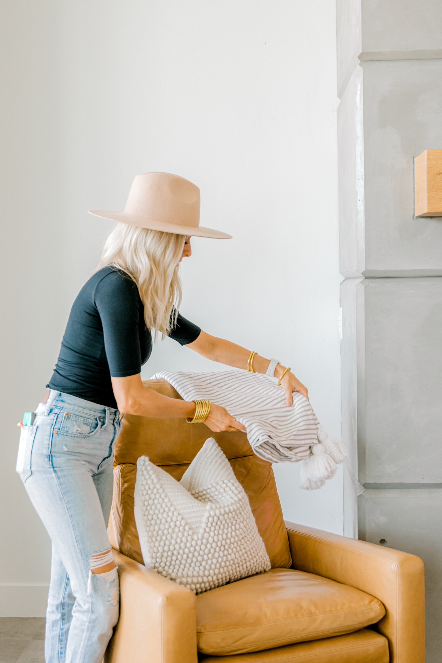 similar top + similar jeans + bracelets + hat || pillow + throw blanket + similar chair