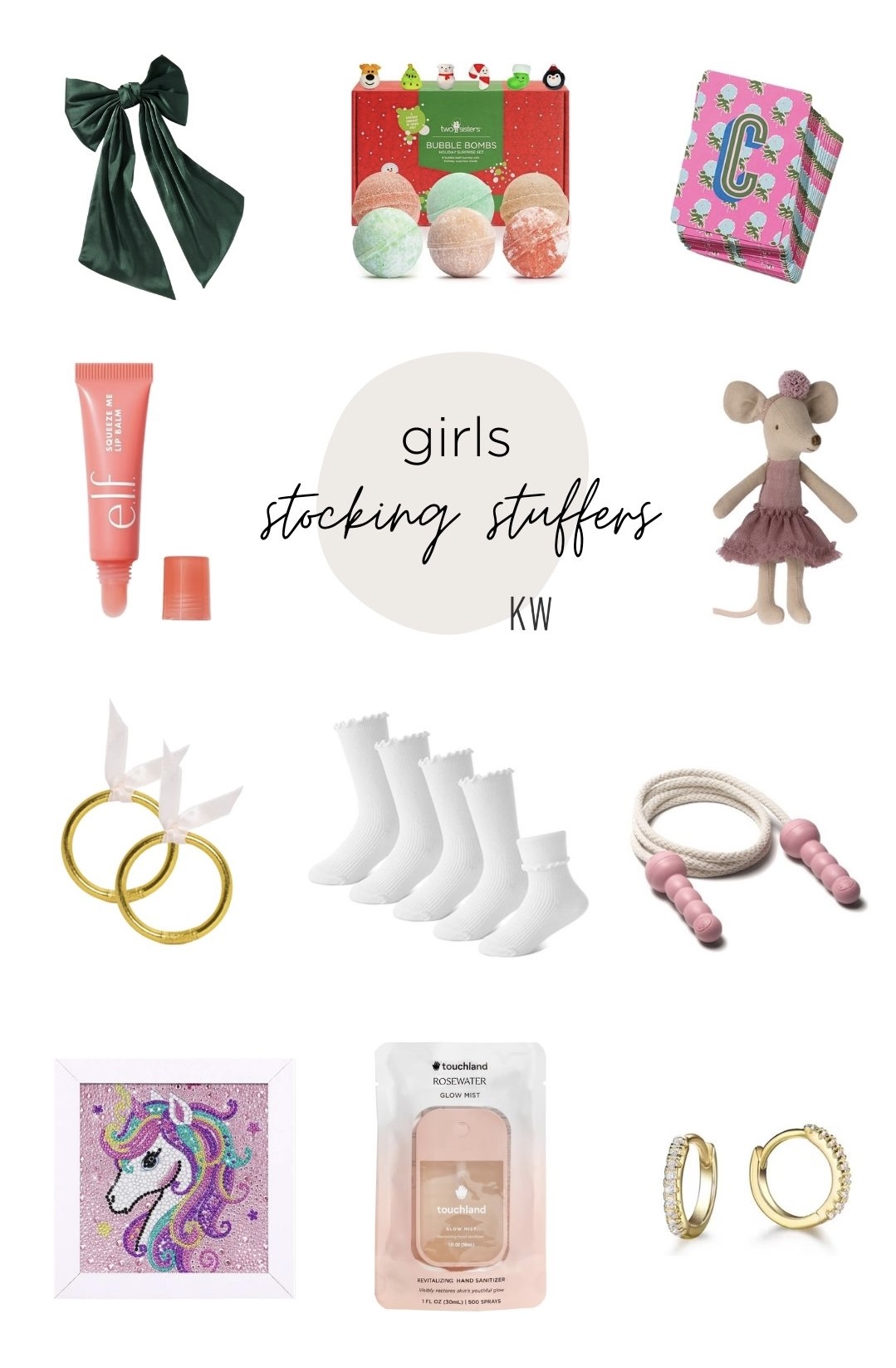 hair bow + bath bombs + cards + elf lip gloss + mouse + bracelets + socks + jump rope + diamond art + hand sanitizer + earrings